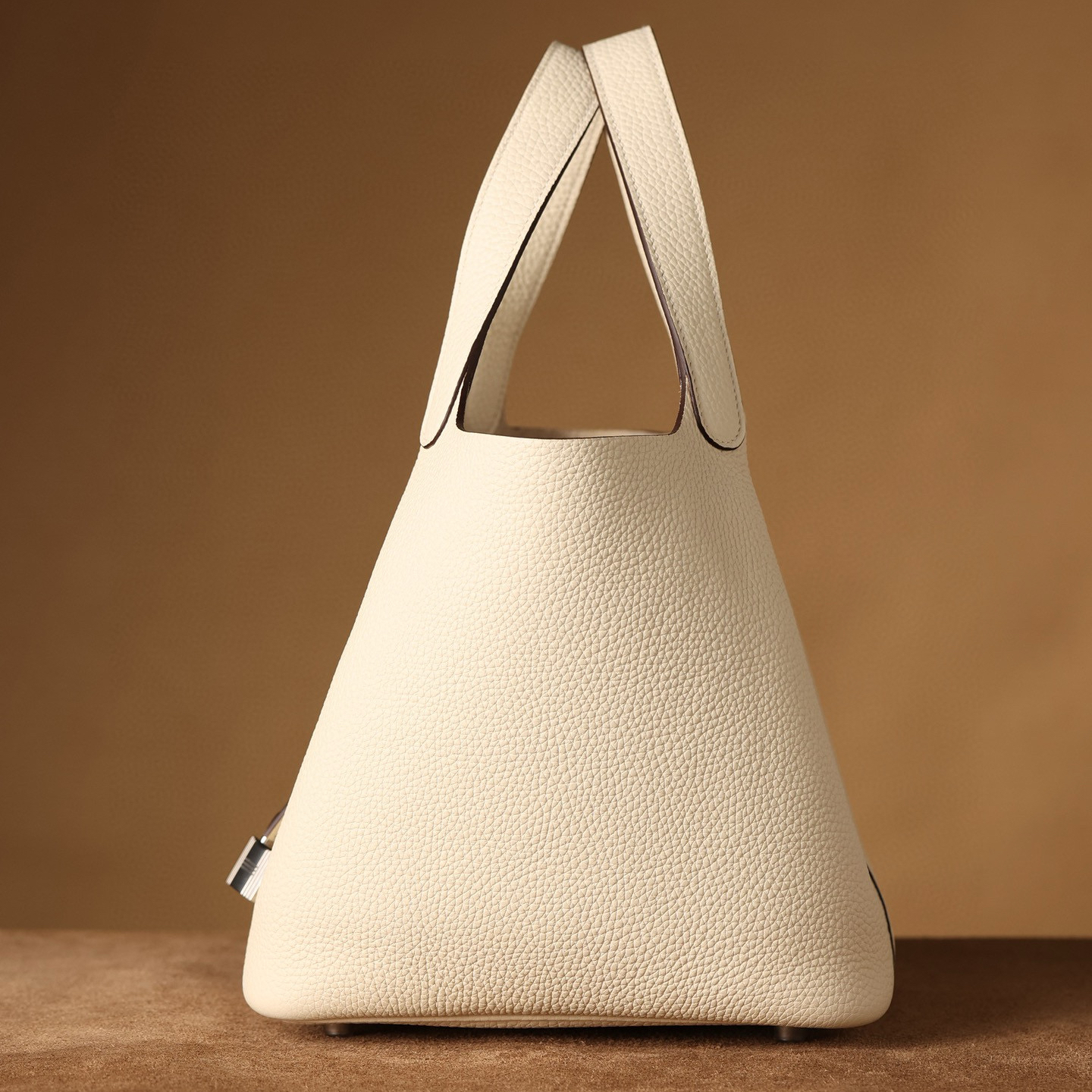 系列:Picotin Lock 款式:手拎 / 手提 尺寸:22.0 x 21.0 x 17.0 厘米 材質:Taurillon Clemence 公牛皮 五金:金屬釦具 工藝解析 此款手提包延續經典水桶輪廓,透過精準的手工縫製展現立體結構。包身採用整張皮革塑形,無需內部框架支撐即能保持優雅廓形,體現對材料特性的深刻掌握。標誌性鎖扣裝置經過精密計算,與皮革開口完美契合,確保使用時的順暢手感與視覺平衡。 細節賞析 皮料:精選Taurillon Clemence公牛皮,天然顆粒紋理細膩均勻,奶油白色調溫潤典雅。這種皮革隨著使用時間會逐漸軟化,形成個人化的使用痕跡。 縫線:均勻緻密的手工縫線沿包身輪廓延伸,轉角處的加固處理展現實用美學。每英寸針數保持一致,展現精湛的手工技藝。 五金:鎖扣採用拋光金屬製作,銀色光澤清冷雅致,邊緣經過圓滑處理。五金件與皮革的接合處處理整潔,體現對細節的關注。 結構:開放式頂部設計搭配兩側收褶,創造出隨性而優雅的線條。加寬的包底確保站立穩定性,同時提供充足的收納空間。 風格與氣質 Picotin Lock 22以適中的尺寸與奶油白溫潤色調,展現經典優雅氣息。奶油白的柔和色澤搭配冷色調金屬配件,呈現出溫潤高級的視覺效果。其典雅的造型語言能夠融入多種穿搭風格,從休閒裝束到正式場合皆能自然搭配,傳遞出獨特的品味主張。 這款手提包體現了現代奢侈品對實用功能的重視,其設計哲學強調在日常使用中展現低調優雅。對於追求品質生活的鑑賞家而言,它代表了對經典設計的當代理解。