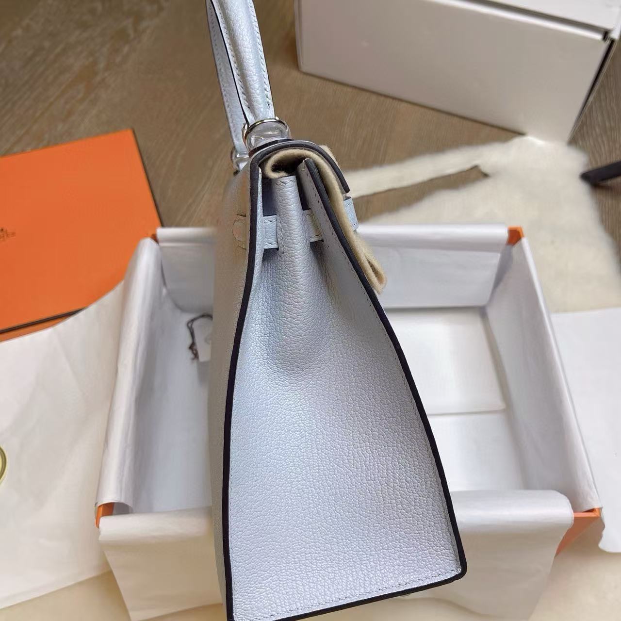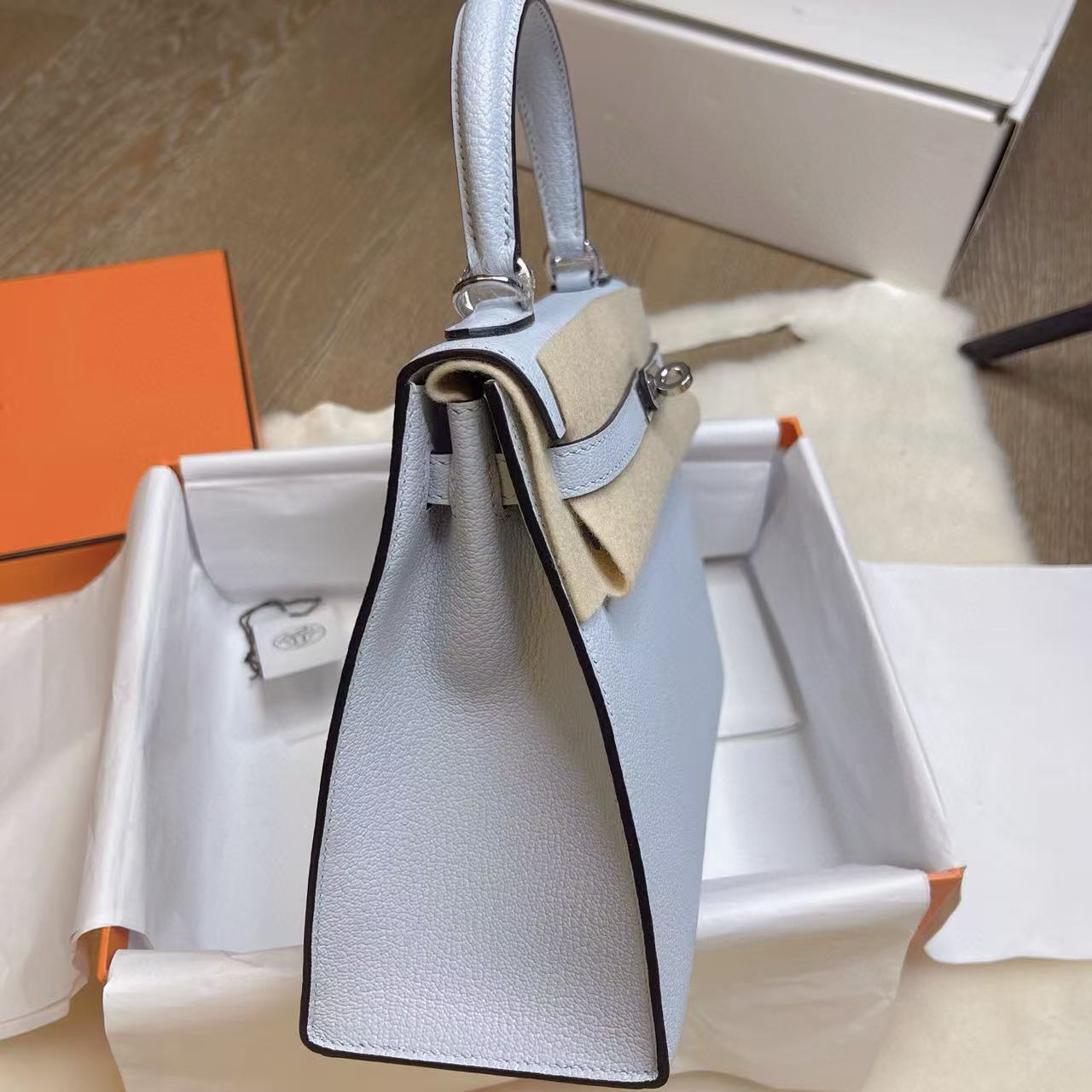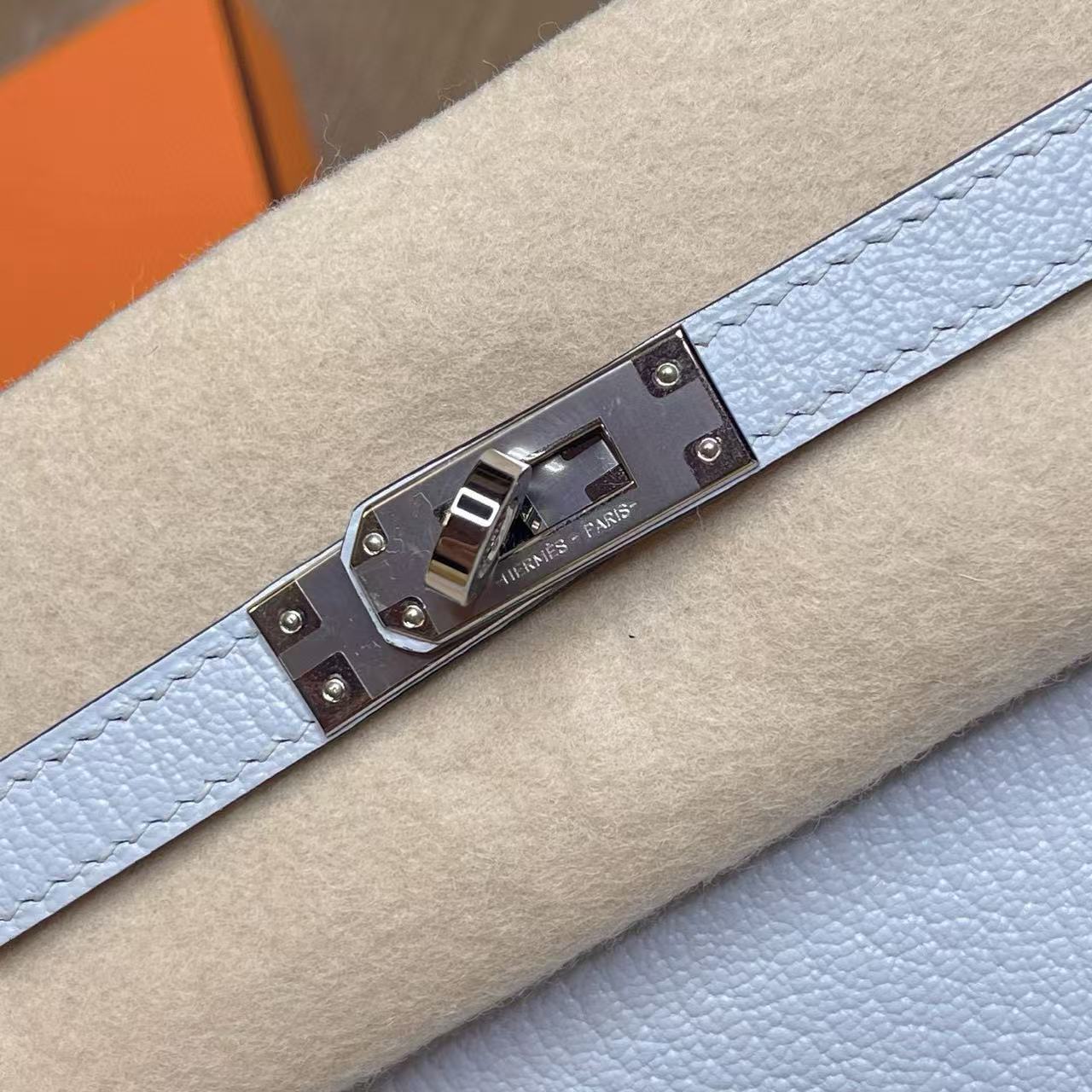 Hermès Kelly 25 —— 外缝迷雾蓝银扣,冷静优雅的都市典范 系列:Hermes-Kelly 貨號:H079234CK8U 品質:正品 100% 級 工藝:純手工打造 款式:單肩/手提 尺寸:25.0 * 7.0 * 17.0 CM 材質:钯金 Palladium 皮質:蜥蜴皮 Lizard Skin 包裝清單:防塵袋 / 原盒 / 鎖 / 鑰匙 閉合方式:銀扣 官網發售價格:$35000 ⸻ 經典定位 Kelly 系列向來以梯形翻蓋與挺括線條著稱,25 尺寸更是在精緻與實用之間取得完美平衡。迷霧藍色調低調而不失格調,如同晨曦中薄霧籠罩的天空,冷靜、純粹且耐看。外縫工藝則讓線條更為鮮明,展現出一份俐落與力量感。 材質特徵(Lizard Skin) • 蜥蜴皮以細密規整的鱗片著稱,光澤天然且隨角度呈現微妙變化。 • 迷霧藍與蜥蜴皮的細膩紋理相互交織,映襯出宛如寶石般的光澤感。 • 相較於小牛皮,蜥蜴皮更顯珍稀奢華,屬於收藏級皮質,需精心呵護。 五金與工藝 • 銀扣(Palladium)與冷調藍色相互呼應,氣質內斂大方。 • 外縫結構凸顯邊線利落,搭配馬鞍針手工縫製,整體線條挺括有型。 • 邊角細膩打磨,層層邊油處理,細節處盡顯愛馬仕高定級工藝。 佩戴與容量 25 尺寸 Kelly,適合手提凸顯優雅氣場,也可肩背增添靈動。容量足以容納手機、卡包、口紅與日常隨身小物,是日常與場合兼顧的理想選擇。 保養要點 蜥蜴皮對環境較敏感,建議避免長時間陽光直射與潮濕環境。存放時需放置於防塵袋中,並保持乾燥通風,以延續皮質光澤。 結語 Hermès Kelly 25 外缝迷雾蓝銀扣,將理性冷靜的色調與珍稀蜥蜴皮相融合,既有女性優雅的柔和,又蘊含俐落的力量感。它不僅是一件配飾,更是一份可以傳承的經典收藏。