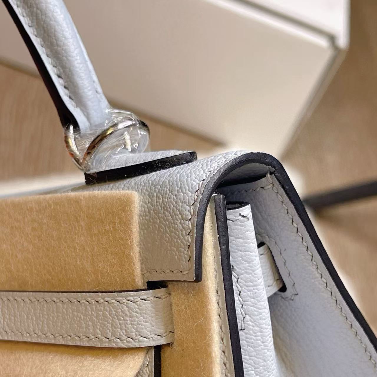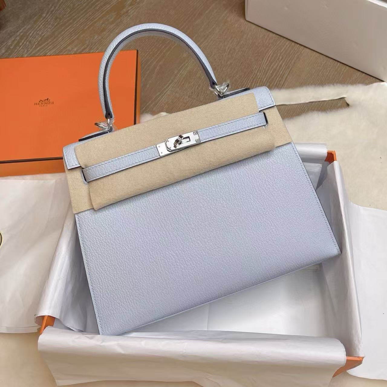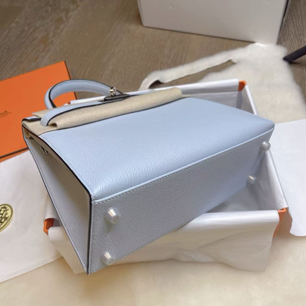 Hermès Kelly 25 —— 外缝迷雾蓝银扣,冷静优雅的都市典范 系列:Hermes-Kelly 貨號:H079234CK8U 品質:正品 100% 級 工藝:純手工打造 款式:單肩/手提 尺寸:25.0 * 7.0 * 17.0 CM 材質:钯金 Palladium 皮質:蜥蜴皮 Lizard Skin 包裝清單:防塵袋 / 原盒 / 鎖 / 鑰匙 閉合方式:銀扣 官網發售價格:$35000 ⸻ 經典定位 Kelly 系列向來以梯形翻蓋與挺括線條著稱,25 尺寸更是在精緻與實用之間取得完美平衡。迷霧藍色調低調而不失格調,如同晨曦中薄霧籠罩的天空,冷靜、純粹且耐看。外縫工藝則讓線條更為鮮明,展現出一份俐落與力量感。 材質特徵(Lizard Skin) • 蜥蜴皮以細密規整的鱗片著稱,光澤天然且隨角度呈現微妙變化。 • 迷霧藍與蜥蜴皮的細膩紋理相互交織,映襯出宛如寶石般的光澤感。 • 相較於小牛皮,蜥蜴皮更顯珍稀奢華,屬於收藏級皮質,需精心呵護。 五金與工藝 • 銀扣(Palladium)與冷調藍色相互呼應,氣質內斂大方。 • 外縫結構凸顯邊線利落,搭配馬鞍針手工縫製,整體線條挺括有型。 • 邊角細膩打磨,層層邊油處理,細節處盡顯愛馬仕高定級工藝。 佩戴與容量 25 尺寸 Kelly,適合手提凸顯優雅氣場,也可肩背增添靈動。容量足以容納手機、卡包、口紅與日常隨身小物,是日常與場合兼顧的理想選擇。 保養要點 蜥蜴皮對環境較敏感,建議避免長時間陽光直射與潮濕環境。存放時需放置於防塵袋中,並保持乾燥通風,以延續皮質光澤。 結語 Hermès Kelly 25 外缝迷雾蓝銀扣,將理性冷靜的色調與珍稀蜥蜴皮相融合,既有女性優雅的柔和,又蘊含俐落的力量感。它不僅是一件配飾,更是一份可以傳承的經典收藏。
