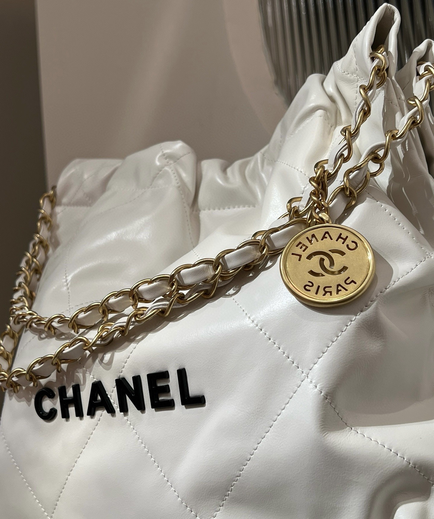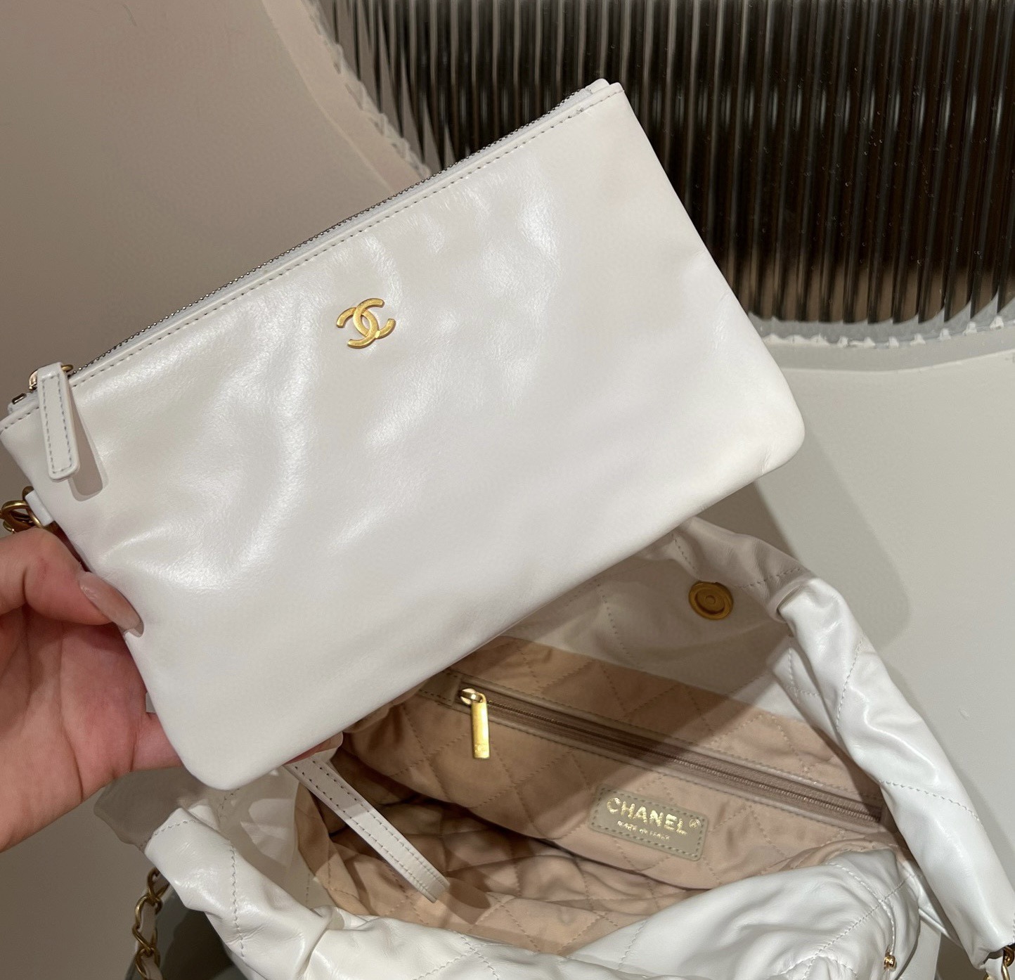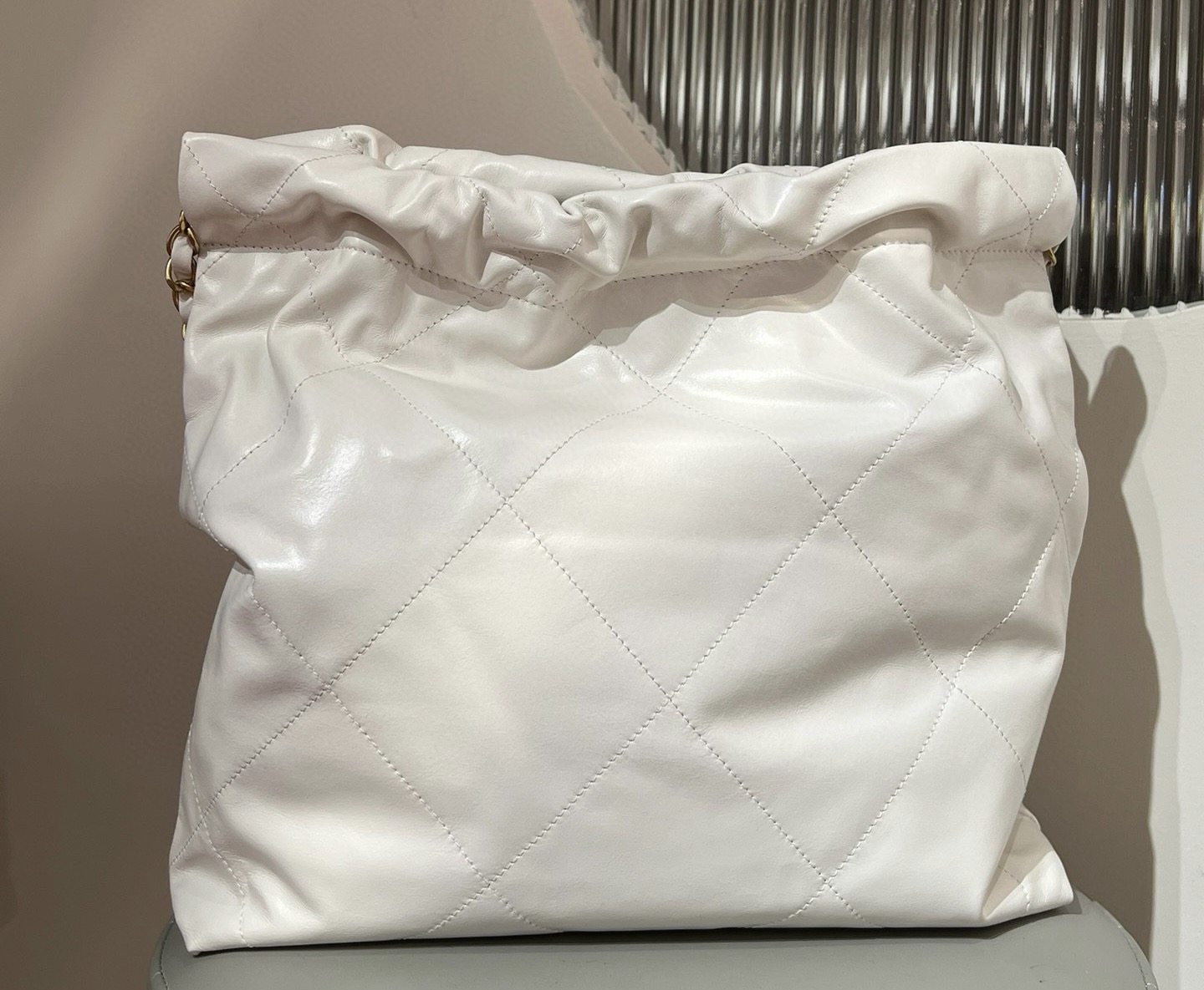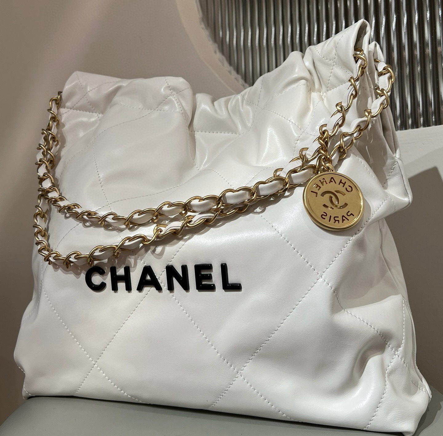 基本資訊|Chanel 22 Bag 購物袋 白色 小號 黑色LOGO Chanel 22 Bag 購物袋以柔軟廓形與輕量設計為核心,打破傳統翻蓋包結構,呈現更貼近日常使用的時尚風格。小號尺寸在保留購物袋隨性輪廓的同時,更適合日常外出、通勤與輕度收納需求。 整體以**白色小牛皮(Calf Leather)**製作,皮質柔軟細膩,表面光澤自然,使包身呈現輕盈、乾淨且具現代感的視覺效果。白色調放大 22 Bag 的鬆弛輪廓特色,是 Chanel 當代系列中兼具造型感與實用性的代表款式。隨附防塵袋、原裝盒與說明書。 款式:肩背 尺寸:小號 材質:小牛皮(Calf Leather) 尺寸:35*37*7cm 皮質特徵:柔軟、細膩、自然光澤 五金:金屬鏈條、金屬字母吊飾 閉合方式:抽繩式 隨附:防塵袋、原裝盒、說明書 工藝解析|Chanel 22 Bag 的柔軟結構 Chanel 22 Bag 採用軟結構設計,透過皮革自然垂墜呈現輕鬆輪廓。小牛皮在保持柔軟手感的同時,具備良好延展性與回彈力,使包身在日常使用後仍能維持整體形態。 抽繩結構與金屬鏈條的結合,兼顧實用收納與視覺層次,體現 Chanel 對現代包款比例與功能性的重新詮釋。 細節賞析 白色小牛皮質感 白色小牛皮皮面細膩平滑,光澤低調自然,使包款整體顯得輕盈乾淨,適合春夏及淺色系穿搭。 包身輪廓 購物袋造型線條柔和,包身自然垂墜,營造隨性不拘的時尚氛圍,與傳統結構包形成鮮明風格差異。 抽繩與五金 金屬抽繩搭配 Chanel 字母吊飾,增添品牌識別度,同時提升使用便利性與整體造型完成度。 鏈條肩帶 金屬鏈條比例適中,肩背舒適,與柔軟皮革形成材質對比,強化視覺層次。 容量與使用體驗 小號尺寸內部空間寬敞,可輕鬆收納手機、長短夾、化妝包與隨身物品。柔軟皮革使包身更貼合身形,肩背時輕盈自然,適合日常高頻率使用。 保養建議|白色小牛皮 白色小牛皮建議避免與深色衣物長時間摩擦,並遠離水漬與油污。日常可使用柔軟乾布輕拭皮面,存放時置於防塵袋內,保持乾燥通風,以維持皮革色澤與質感。 風格與定位|Chanel 22 Bag 小號 Chanel 22 Bag 購物袋白色小號的風格關鍵在於「輕鬆 × 現代 × 實用」: • 柔軟小牛皮呈現自然垂墜感 • 白色調放大清爽與時尚度 • 購物袋輪廓適合日常與通勤 是一款兼具實用容量、現代造型與品牌辨識度的 Chanel 22 Bag 白色小號購物袋。