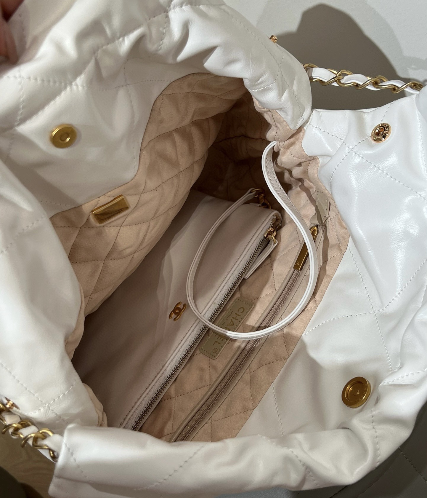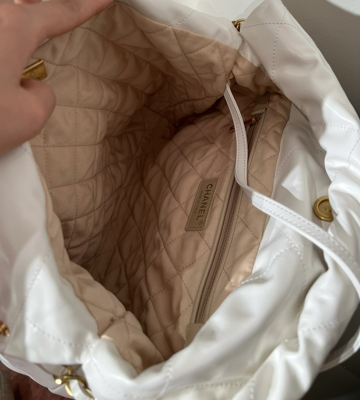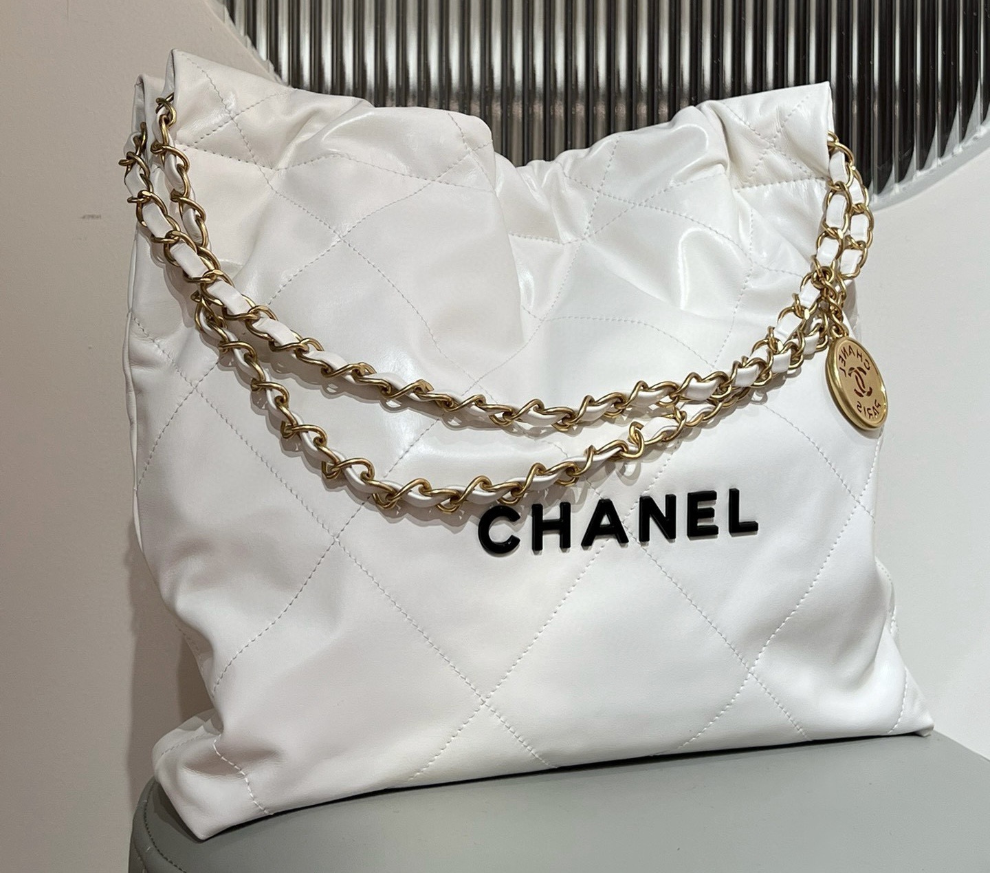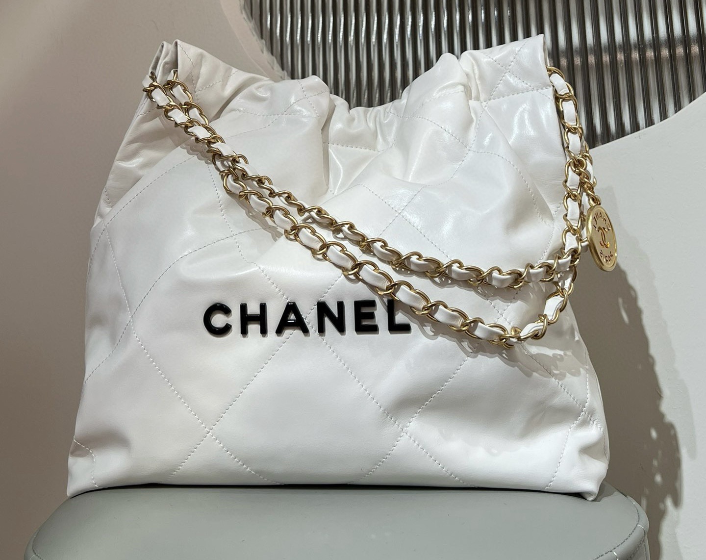 基本資訊|Chanel 22 Bag 購物袋 白色 小號 黑色LOGO Chanel 22 Bag 購物袋以柔軟廓形與輕量設計為核心,打破傳統翻蓋包結構,呈現更貼近日常使用的時尚風格。小號尺寸在保留購物袋隨性輪廓的同時,更適合日常外出、通勤與輕度收納需求。 整體以**白色小牛皮(Calf Leather)**製作,皮質柔軟細膩,表面光澤自然,使包身呈現輕盈、乾淨且具現代感的視覺效果。白色調放大 22 Bag 的鬆弛輪廓特色,是 Chanel 當代系列中兼具造型感與實用性的代表款式。隨附防塵袋、原裝盒與說明書。 款式:肩背 尺寸:小號 材質:小牛皮(Calf Leather) 尺寸:35*37*7cm 皮質特徵:柔軟、細膩、自然光澤 五金:金屬鏈條、金屬字母吊飾 閉合方式:抽繩式 隨附:防塵袋、原裝盒、說明書 工藝解析|Chanel 22 Bag 的柔軟結構 Chanel 22 Bag 採用軟結構設計,透過皮革自然垂墜呈現輕鬆輪廓。小牛皮在保持柔軟手感的同時,具備良好延展性與回彈力,使包身在日常使用後仍能維持整體形態。 抽繩結構與金屬鏈條的結合,兼顧實用收納與視覺層次,體現 Chanel 對現代包款比例與功能性的重新詮釋。 細節賞析 白色小牛皮質感 白色小牛皮皮面細膩平滑,光澤低調自然,使包款整體顯得輕盈乾淨,適合春夏及淺色系穿搭。 包身輪廓 購物袋造型線條柔和,包身自然垂墜,營造隨性不拘的時尚氛圍,與傳統結構包形成鮮明風格差異。 抽繩與五金 金屬抽繩搭配 Chanel 字母吊飾,增添品牌識別度,同時提升使用便利性與整體造型完成度。 鏈條肩帶 金屬鏈條比例適中,肩背舒適,與柔軟皮革形成材質對比,強化視覺層次。 容量與使用體驗 小號尺寸內部空間寬敞,可輕鬆收納手機、長短夾、化妝包與隨身物品。柔軟皮革使包身更貼合身形,肩背時輕盈自然,適合日常高頻率使用。 保養建議|白色小牛皮 白色小牛皮建議避免與深色衣物長時間摩擦,並遠離水漬與油污。日常可使用柔軟乾布輕拭皮面,存放時置於防塵袋內,保持乾燥通風,以維持皮革色澤與質感。 風格與定位|Chanel 22 Bag 小號 Chanel 22 Bag 購物袋白色小號的風格關鍵在於「輕鬆 × 現代 × 實用」: • 柔軟小牛皮呈現自然垂墜感 • 白色調放大清爽與時尚度 • 購物袋輪廓適合日常與通勤 是一款兼具實用容量、現代造型與品牌辨識度的 Chanel 22 Bag 白色小號購物袋。