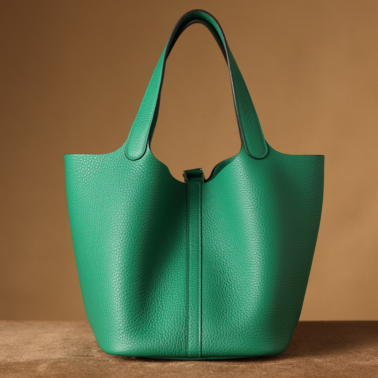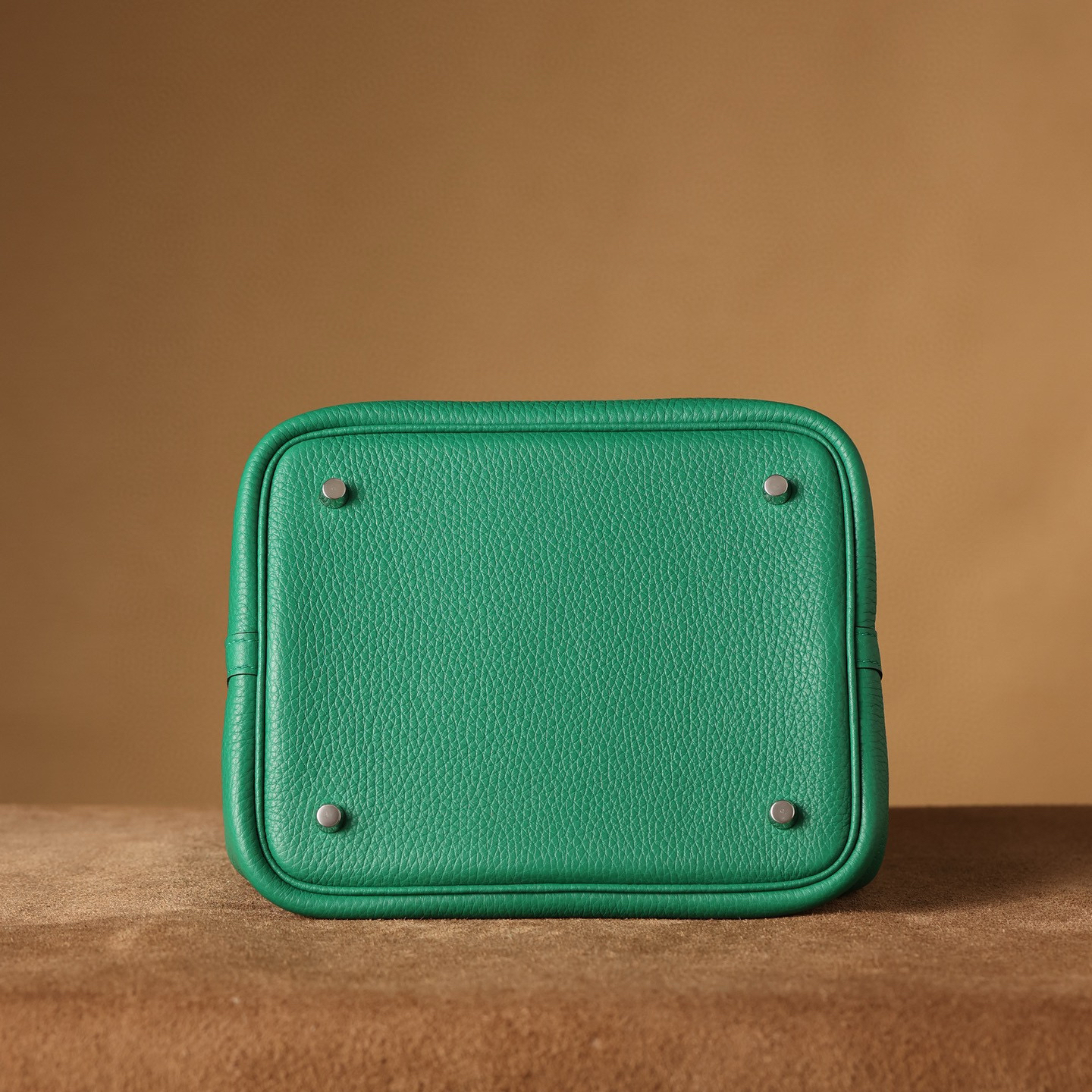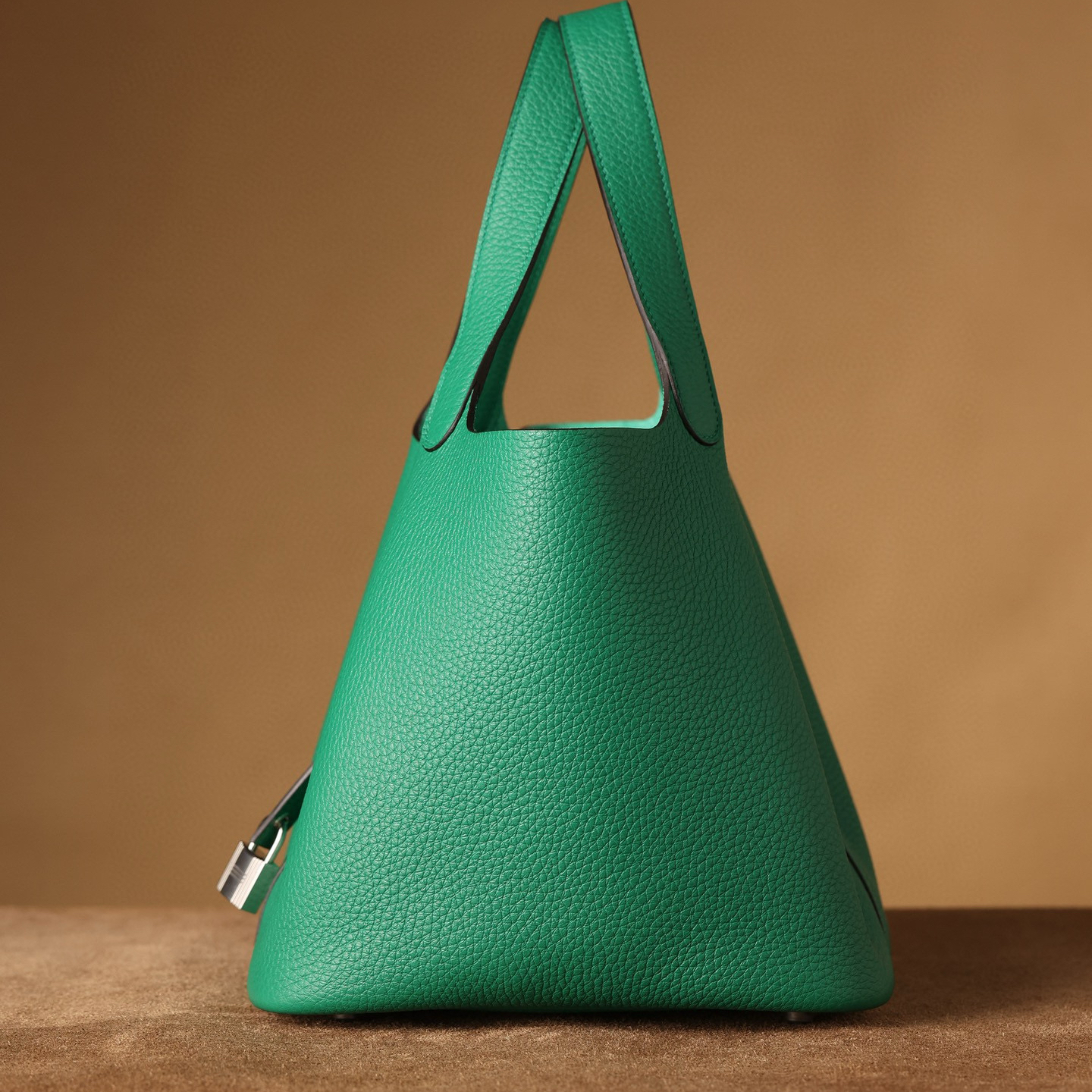 系列:Picotin Lock 款式:手拎 / 手提 尺寸:22.0 x 21.0 x 17.0 厘米 材質:Taurillon Clemence 公牛皮 五金:金屬釦具 工藝解析 此款手提包延續經典水桶輪廓,透過精準的手工縫製展現立體結構。包身採用整張皮革塑形,無需內部框架支撐即能保持優雅廓形,體現對材料特性的深刻掌握。標誌性鎖扣裝置經過精密計算,與皮革開口完美契合,確保使用時的順暢手感與視覺平衡。 細節賞析 皮料:精選Taurillon Clemence公牛皮,天然顆粒紋理細膩均勻,絲絨綠色調深邃典雅。這種皮革隨著使用時間會逐漸軟化,形成個人化的使用痕跡。 縫線:均勻緻密的手工縫線沿包身輪廓延伸,轉角處的加固處理展現實用美學。每英寸針數保持一致,展現精湛的手工技藝。 五金:鎖扣採用拋光金屬製作,銀色光澤清冷雅致,邊緣經過圓滑處理。五金件與皮革的接合處處理整潔,體現對細節的關注。 結構:開放式頂部設計搭配兩側收褶,創造出隨性而優雅的線條。加寬的包底確保站立穩定性,同時提供充足的收納空間。 風格與氣質 Picotin Lock 22以適中的尺寸與絲絨綠深邃色調,展現獨特優雅氣息。絲絨綠的神秘色澤搭配冷色調金屬配件,呈現出與眾不同的視覺效果。其典雅的造型語言能夠融入多種穿搭風格,從休閒裝束到正式場合皆能自然搭配,傳遞出獨特的品味主張。 這款手提包體現了現代奢侈品對實用功能的重視,其設計哲學強調在日常使用中展現低調優雅。對於追求品質生活的鑑賞家而言,它代表了對經典設計的當代理解。