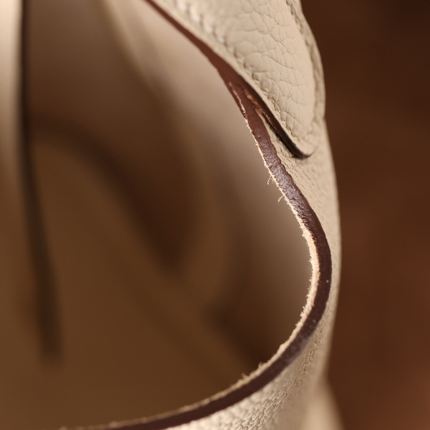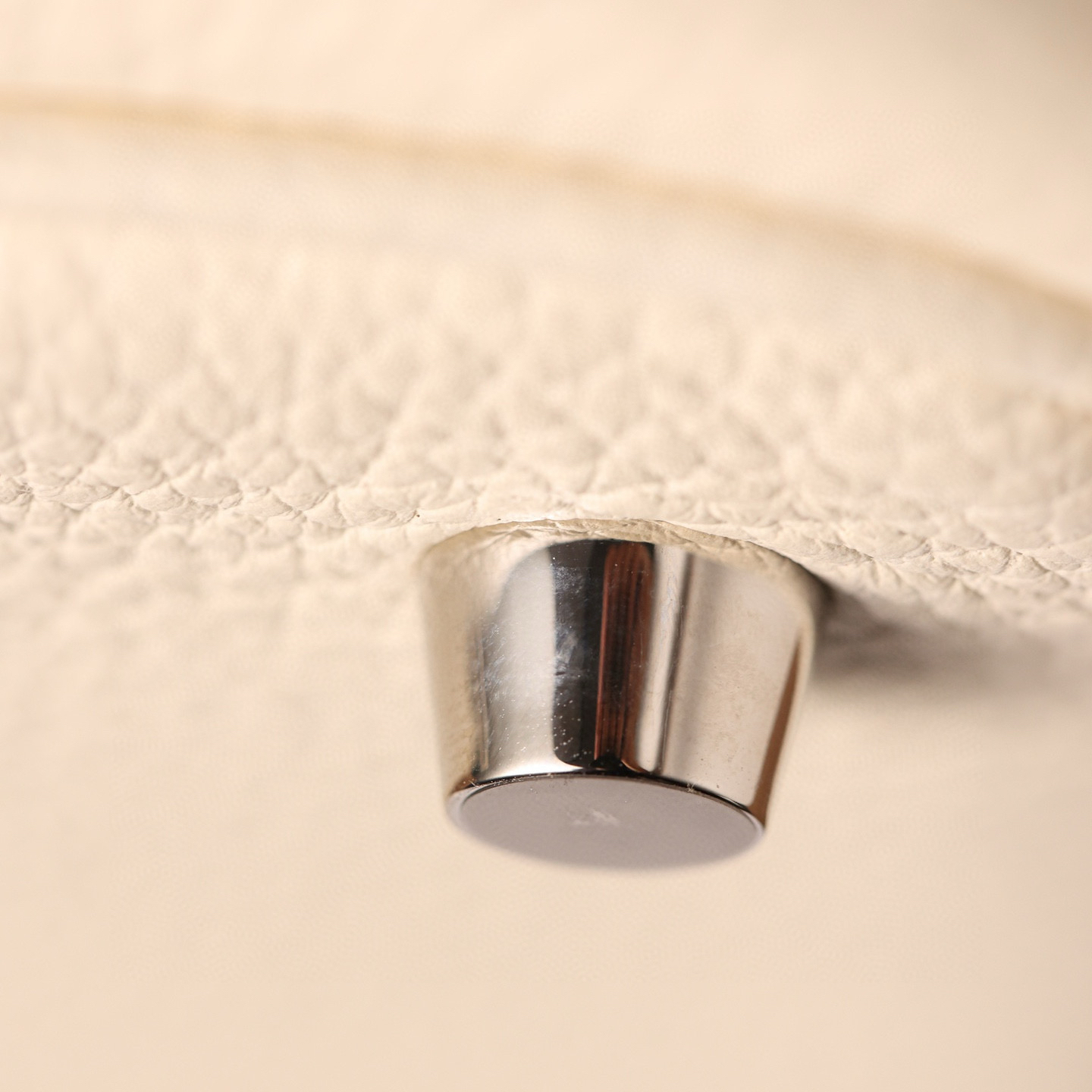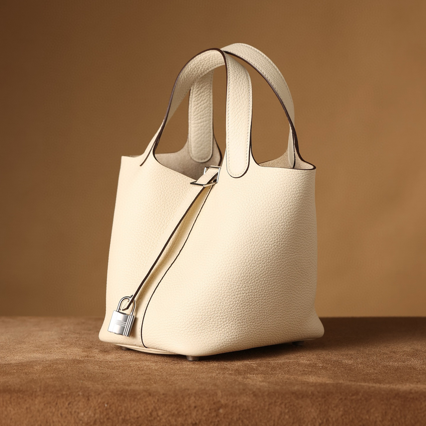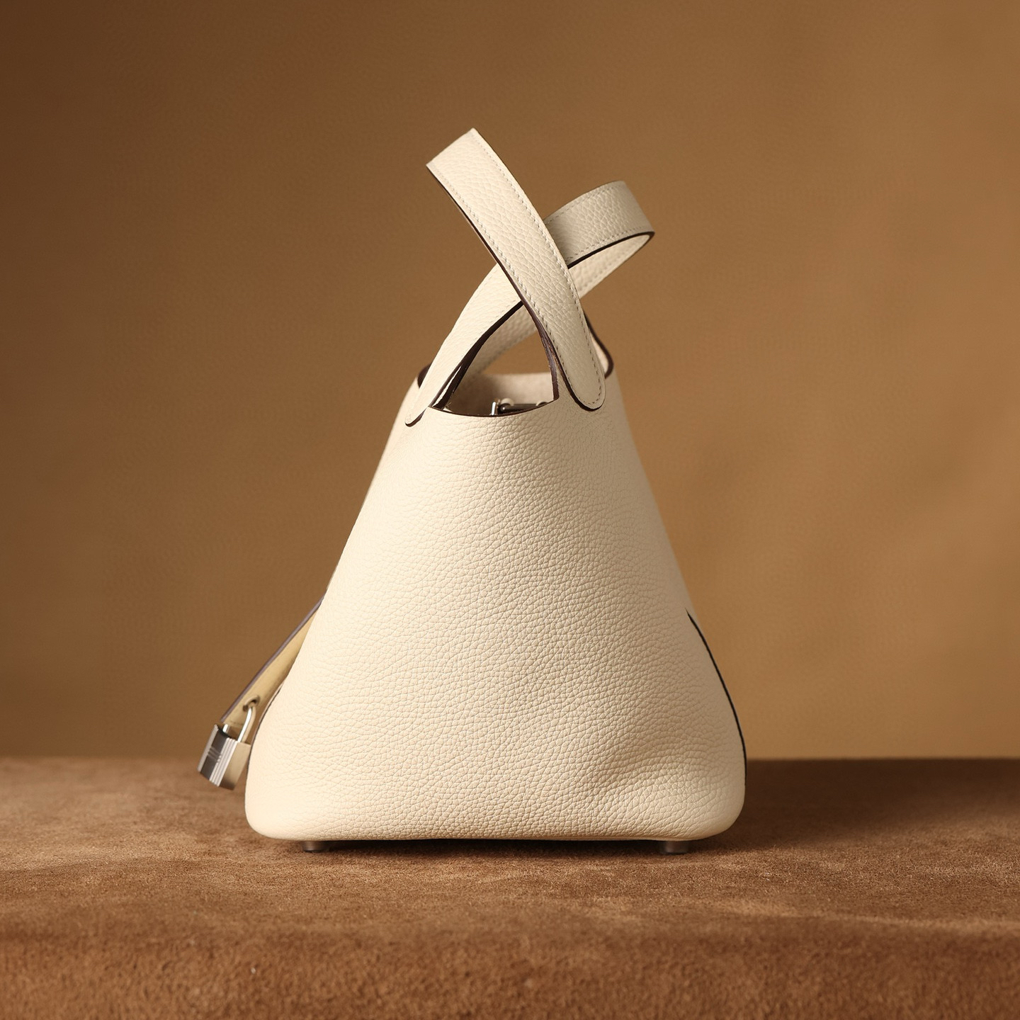 系列:Picotin Lock 款式:手拎 / 手提 尺寸:18.0 x 19.0 x 13.5 厘米 材質:Taurillon Clemence 公牛皮 五金:金屬釦具 工藝解析 此款手提包延續經典水桶輪廓,透過精準的手工縫製展現立體結構。包身採用整張皮革塑形,無需內部框架支撐即能保持優雅廓形,體現對材料特性的深刻掌握。標誌性鎖扣裝置經過精密計算,與皮革開口完美契合,確保使用時的順暢手感與視覺平衡。 細節賞析 皮料:精選Taurillon Clemence公牛皮,天然顆粒紋理細膩均勻,奶油白色調溫潤典雅。這種皮革隨著使用時間會逐漸軟化,形成個人化的使用痕跡。 縫線:均勻緻密的手工縫線沿包身輪廓延伸,轉角處的加固處理展現實用美學。每英寸針數保持一致,展現精湛的手工技藝。 五金:鎖扣採用拋光金屬製作,銀色光澤清冷雅致,邊緣經過圓滑處理。五金件與皮革的接合處處理整潔,體現對細節的關注。 結構:開放式頂部設計搭配兩側收褶,創造出隨性而優雅的線條。加寬的包底確保站立穩定性,同時提供充足的收納空間。 風格與氣質 Picotin Lock 18以精緻的尺寸與奶油白溫潤色調,展現經典優雅氣息。奶油白的柔和色澤搭配冷色調金屬配件,呈現出溫潤高級的視覺效果。其精巧的造型語言能夠融入多種穿搭風格,從休閒裝束到正式場合皆能自然搭配,傳遞出獨特的品味主張。 這款手提包體現了現代奢侈品對實用功能的重視,其設計哲學強調在日常使用中展現低調優雅。對於追求品質生活的鑑賞家而言,它代表了對經典設計的當代理解。