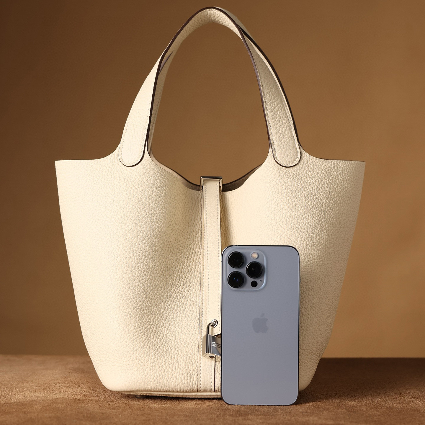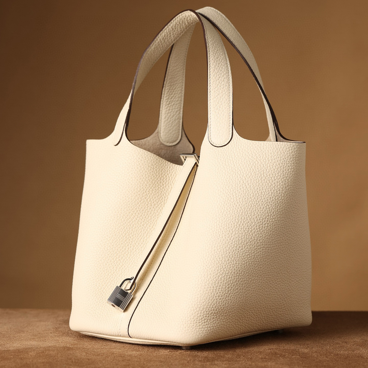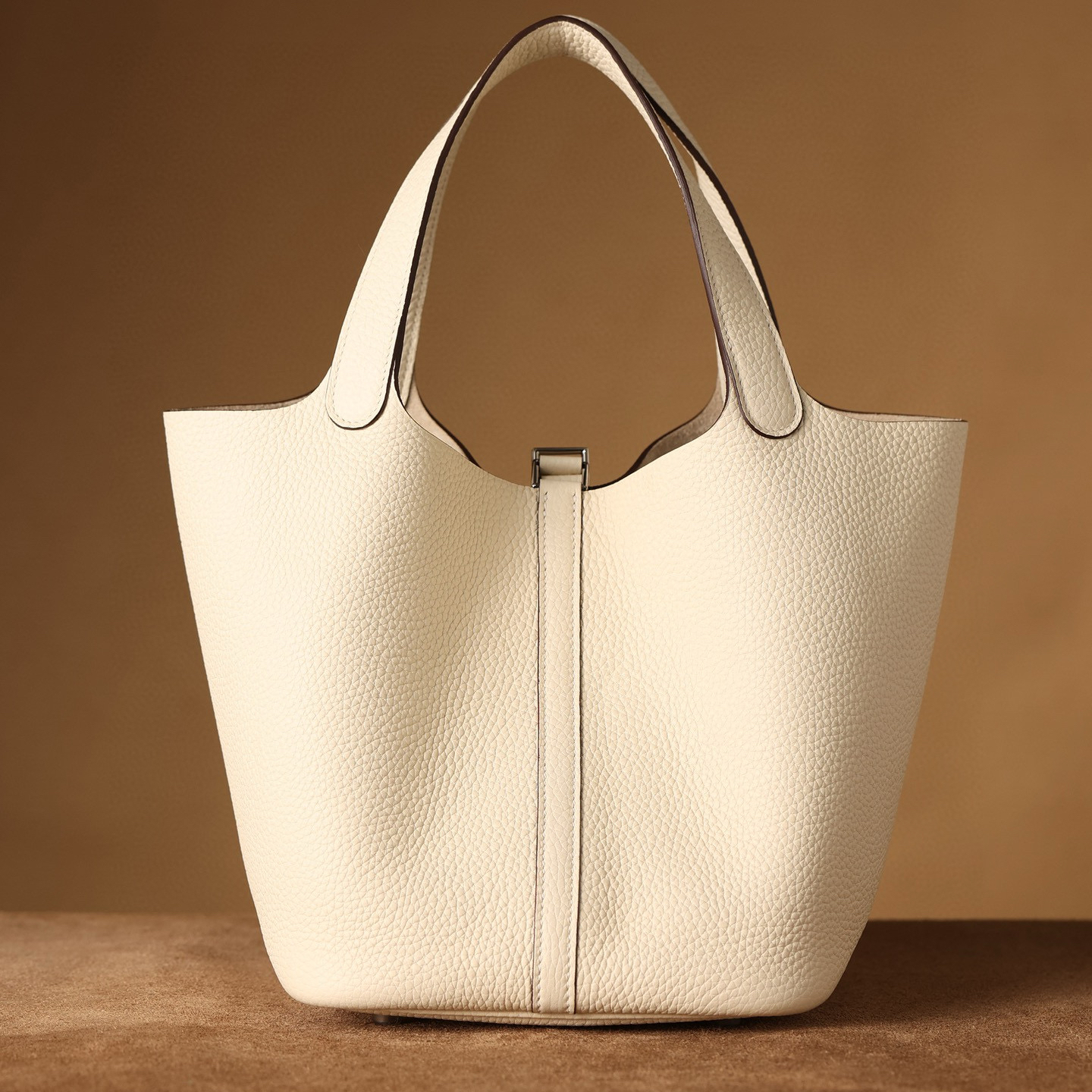 系列:Picotin Lock 款式:手拎 / 手提 尺寸:22.0 x 21.0 x 17.0 厘米 材質:Taurillon Clemence 公牛皮 五金:金屬釦具 工藝解析 此款手提包延續經典水桶輪廓,透過精準的手工縫製展現立體結構。包身採用整張皮革塑形,無需內部框架支撐即能保持優雅廓形,體現對材料特性的深刻掌握。標誌性鎖扣裝置經過精密計算,與皮革開口完美契合,確保使用時的順暢手感與視覺平衡。 細節賞析 皮料:精選Taurillon Clemence公牛皮,天然顆粒紋理細膩均勻,奶油白色調溫潤典雅。這種皮革隨著使用時間會逐漸軟化,形成個人化的使用痕跡。 縫線:均勻緻密的手工縫線沿包身輪廓延伸,轉角處的加固處理展現實用美學。每英寸針數保持一致,展現精湛的手工技藝。 五金:鎖扣採用拋光金屬製作,銀色光澤清冷雅致,邊緣經過圓滑處理。五金件與皮革的接合處處理整潔,體現對細節的關注。 結構:開放式頂部設計搭配兩側收褶,創造出隨性而優雅的線條。加寬的包底確保站立穩定性,同時提供充足的收納空間。 風格與氣質 Picotin Lock 22以適中的尺寸與奶油白溫潤色調,展現經典優雅氣息。奶油白的柔和色澤搭配冷色調金屬配件,呈現出溫潤高級的視覺效果。其典雅的造型語言能夠融入多種穿搭風格,從休閒裝束到正式場合皆能自然搭配,傳遞出獨特的品味主張。 這款手提包體現了現代奢侈品對實用功能的重視,其設計哲學強調在日常使用中展現低調優雅。對於追求品質生活的鑑賞家而言,它代表了對經典設計的當代理解。