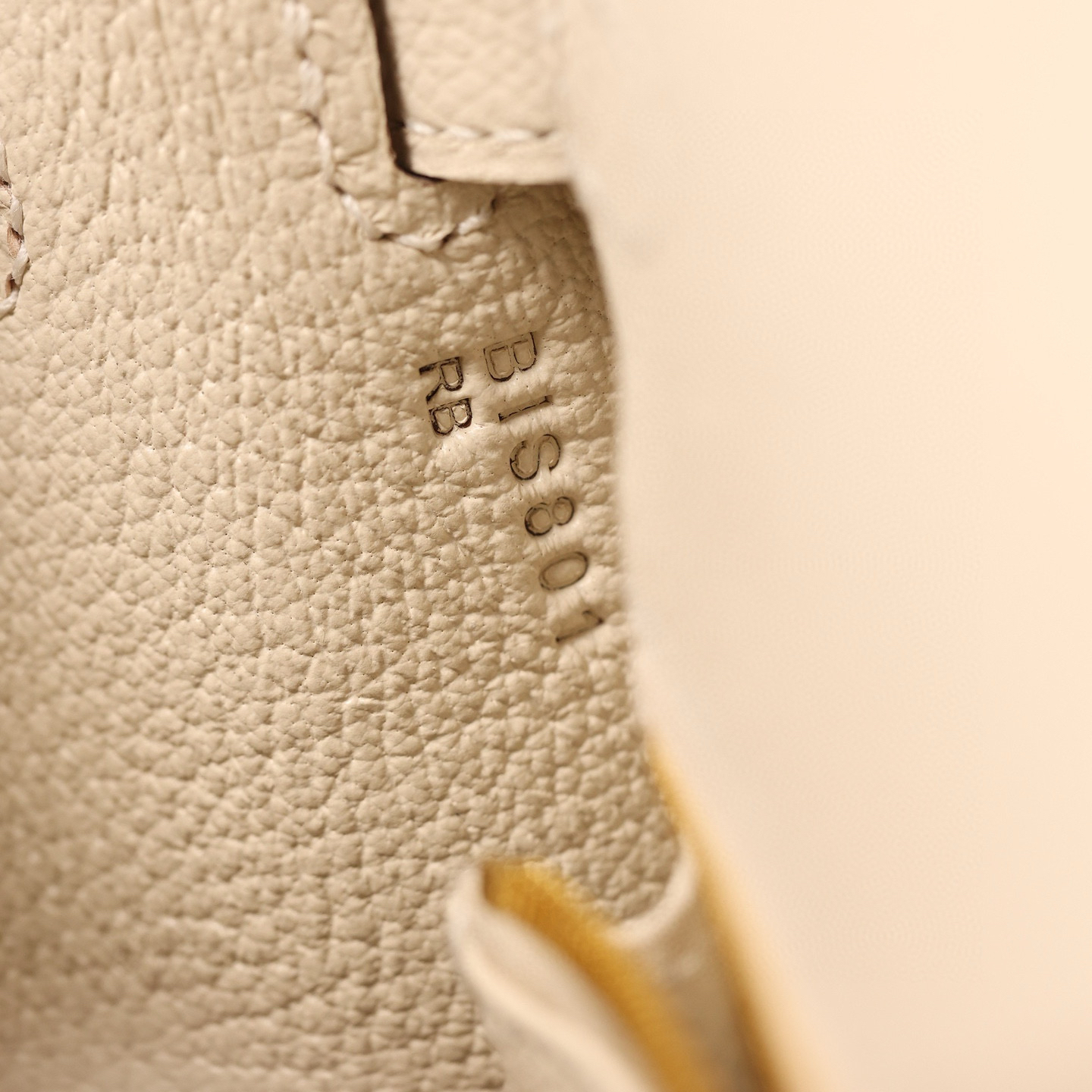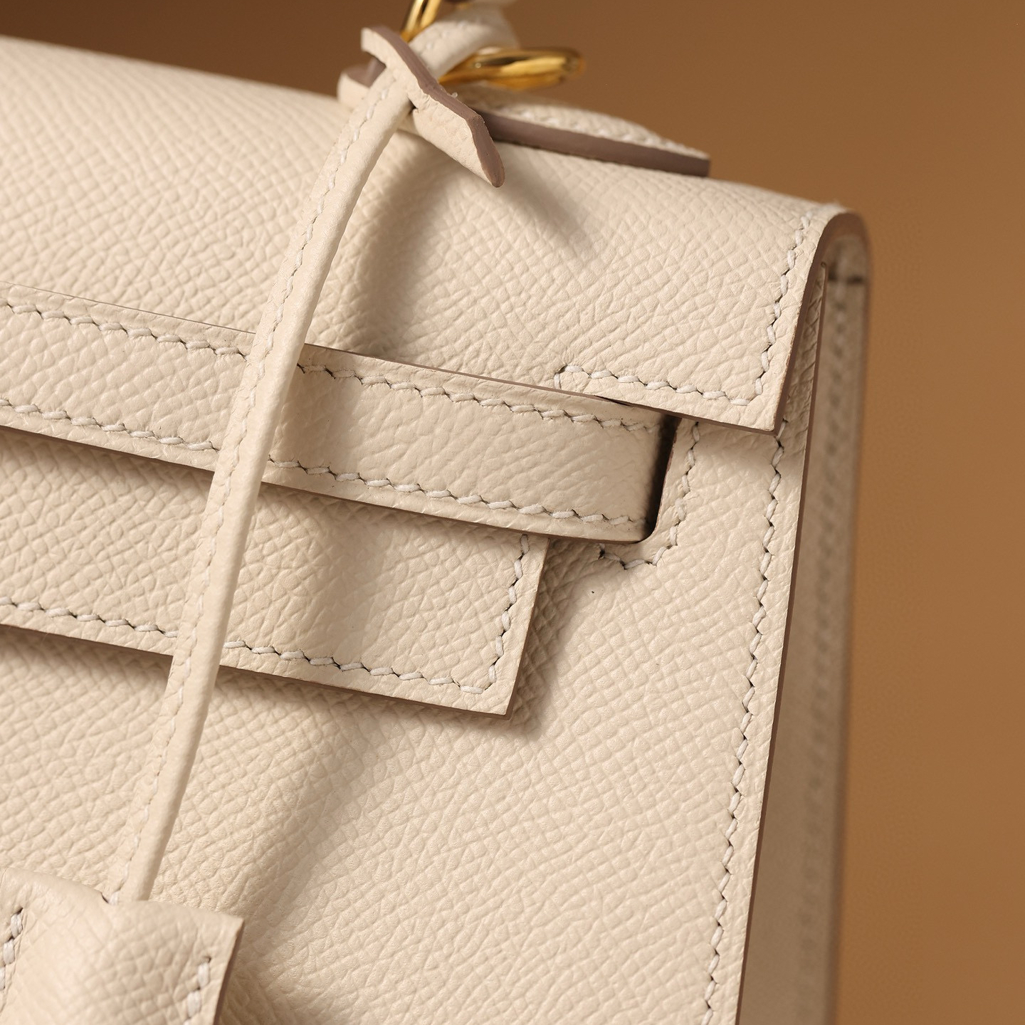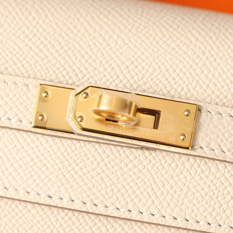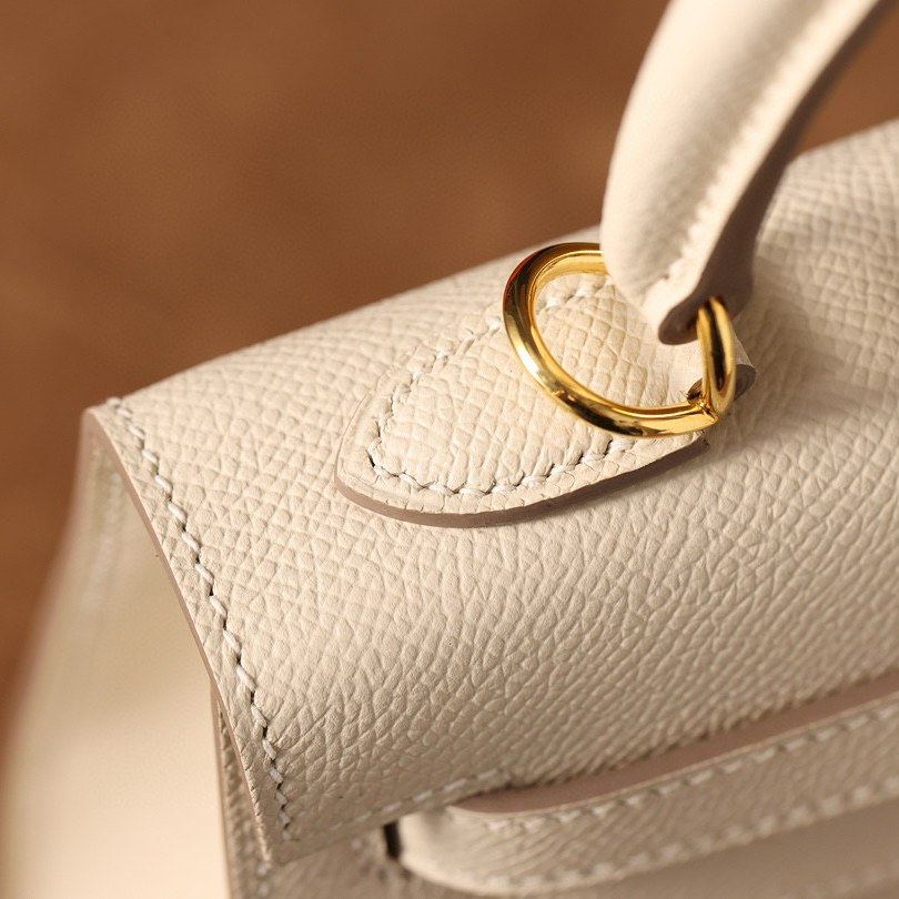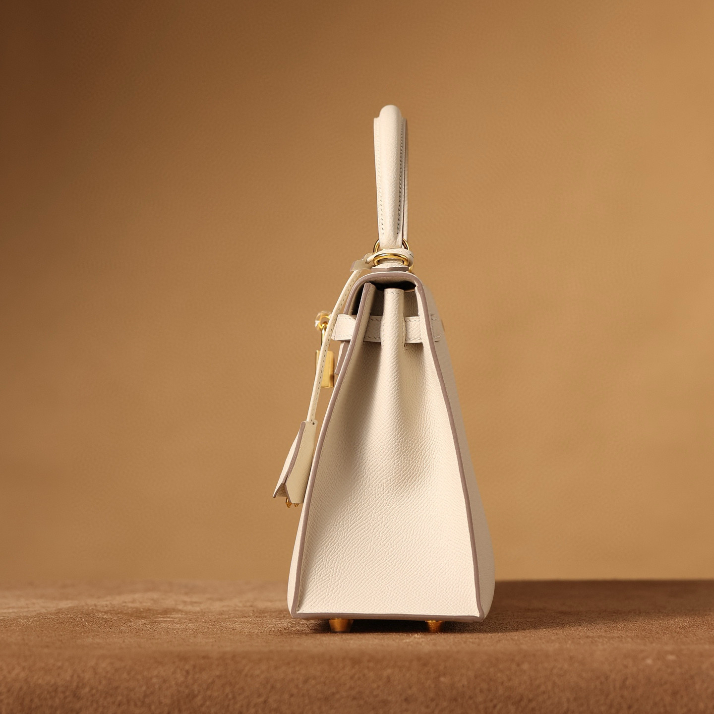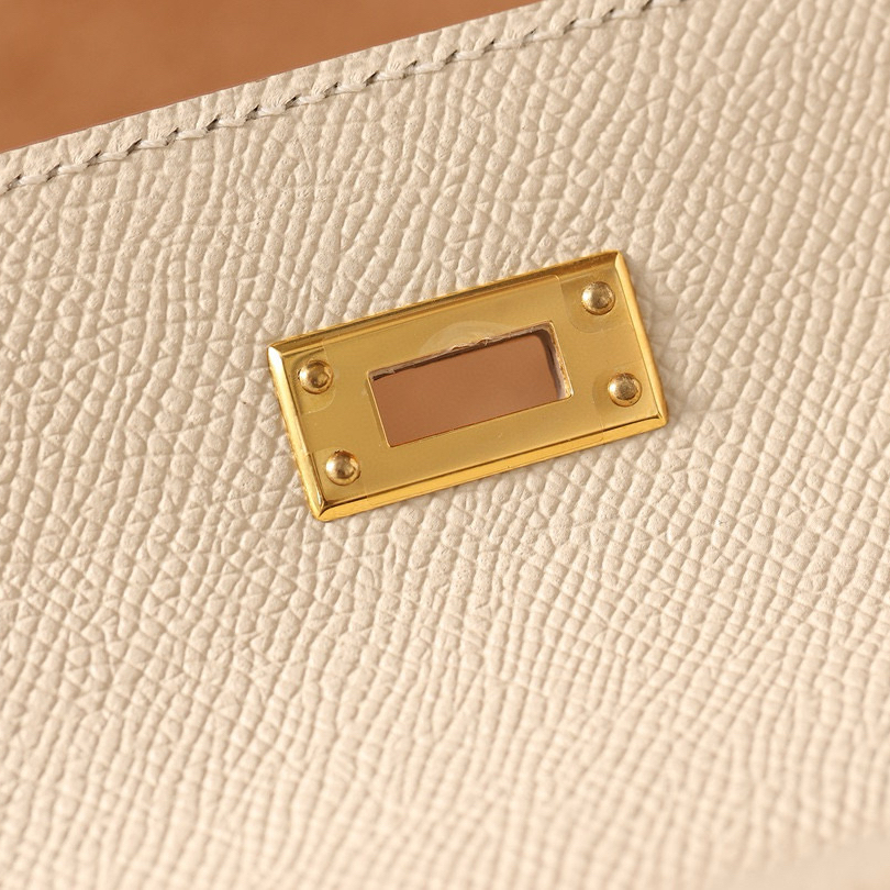 款式:單肩 / 手提 / 斜跨 尺寸:25.0 * 17.0 * 7.0 CM 材質:Epsom皮 / 金屬釦具 皮質:優質小公牛皮,細膩紋理,耐用性強 工藝:純手工打造,注重每一處細節 工藝解析 Hermès Kelly 25手袋選用高品質的Epsom小牛皮,經過精心處理,保留了細緻的掌紋紋理,既擁有柔軟的觸感,又具備卓越的耐用性。每一款手袋都由經驗豐富的匠人手工縫製,從每一針每一線都能體現出Hermès一貫的工藝水準。Epsom皮特有的耐磨性與抗刮性,使其成為日常使用的理想選擇。 細節賞析 皮料:Epsom小牛皮的選材精良,觸感輕盈且耐用,並且具備非常高的抗磨損性,表面紋理細緻美觀,無論是視覺還是觸感都展現了極高的品質感。 縫線:每處縫合均由匠人精心手工完成,線跡均勻且堅固,確保包袋結構的穩定性與耐用性,並完美呈現出整體的工藝水準。 五金:金屬扣具經過精緻打磨,表面光滑並且具備耐久性,與皮革完美融合,展現出低調奢華的品位。 結構:Kelly 25的經典梯形設計讓手袋在功能性與美觀性之間達到完美平衡,無論是日常使用還是特殊場合,都能凸顯佩戴者的優雅氣質。 風格與氣質 Hermès Kelly 25手袋擁有經典的奶昔白色與金扣設計,傳遞著奢華、優雅與獨特的氣質。這款手袋的簡約外觀搭配精緻的細節,使其無論在正式場合還是日常搭配中,都能展現出佩戴者的品位與優雅。其無與倫比的工藝和設計,使其成為奢華生活的象徵。