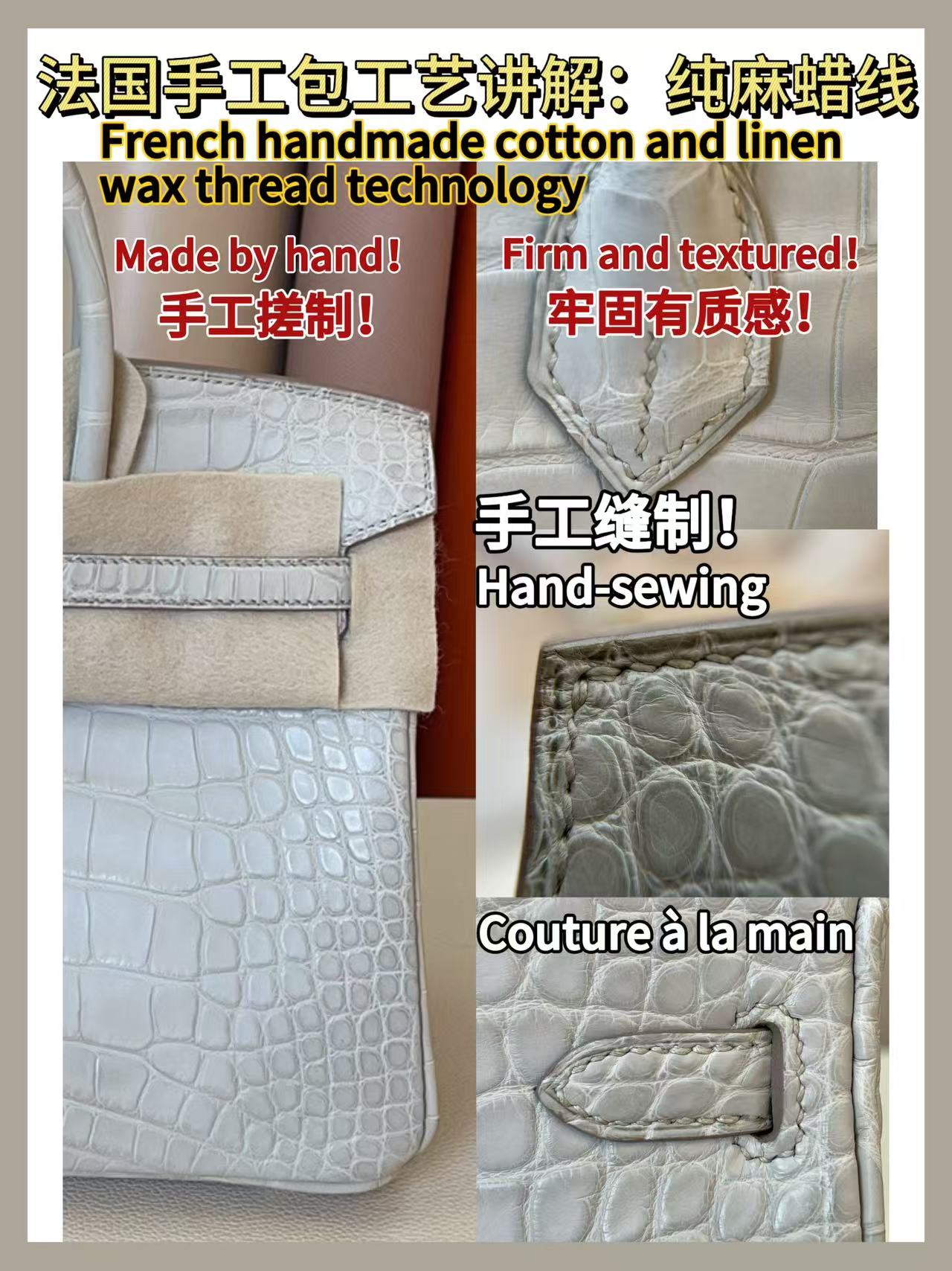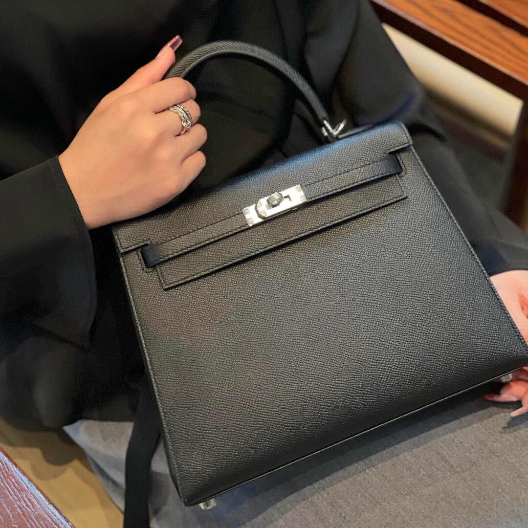款式:單肩 / 手提 / 斜跨 尺寸:25.0 * 17.0 * 7.0 CM 材質:Epsom皮 / 金屬釦具 皮質:優質小公牛皮,細膩紋理,耐用性強 工藝:純手工打造,注重每一處細節 工藝解析 Hermès Kelly 25手袋採用精選Epsom小牛皮,這種皮革擁有優異的柔韌性與耐磨性,經過多道精細工藝處理,表面保留細緻的紋理,觸感輕盈而堅韌。這款手袋完全由經驗豐富的工匠手工製作,每一針每一線都經過精心縫製,確保每個細節都符合Hermès的高標準。 細節賞析 皮料:Epsom小牛皮以其獨特的紋理和高耐用性,在奢侈品中廣受青睞。這種皮料耐磨抗刮,觸感輕盈,為手袋增添了不凡的質感與耐用性。 縫線:每一處縫合均由專業工匠手工完成,線跡均勻且堅固,確保包袋結構的穩定性與持久性。 五金:金屬扣具經過精密打磨,表面光滑,完美搭配皮革的柔軟質感,呈現出低調的奢華感。 結構:Kelly 25的經典設計配以精美的梯形包身,使得整體造型簡約而不失奢華,既能適應日常使用,也能在正式場合中大放異彩。 風格與氣質 Hermès Kelly 25手袋以其極致的工藝和經典設計,完美融合了優雅與實用性。黑色皮質搭配銀扣設計,不僅展現低調的奢華感,還能與各種服飾風格相匹配,無論是日常穿搭還是正式場合,都能讓佩戴者散發出獨特的魅力。其簡約卻不失高雅的外觀,使其成為時尚愛好者的心頭好。