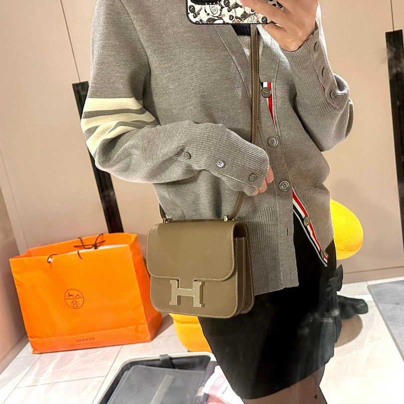系列:Hermès Constance 款式:斜挎/單肩 尺寸:19.0 × 15.0 × 4.0 CM 皮革:Epsom 壓紋公牛皮(手掌紋) 五金:銀色金屬釦具 工藝定位:經典方形結構 × 現代俐落語彙 Constance 19 以其標誌性的方形翻蓋、俐落比例與「H」字母扣而廣為人知。 大象灰(Etoupe)作為 Hermès 色板中極具代表性的中性灰調,搭配銀扣後呈現出成熟、冷靜、乾淨的視覺氛圍,是極為耐看且百搭的組合。 這款尺寸強調「輕盈」「貼合」「精緻」,既保留了結構性,也適合日常跨背與單肩使用。 皮革特徵:Epsom 壓紋皮革(手掌紋) Epsom 是一種經典壓紋公牛皮,適用於需要挺括結構感的包款。 其主要特性包括: 1. 紋理細緻而均勻 皮面帶有規律的細顆粒壓紋,被稱為「手掌紋」,視覺上乾淨清爽,手感輕盈。 2. 輕量且耐磨 Epsom 較其他皮革更輕,適合斜挎與長時間背負,並能在日常使用中保持良好狀態。 3. 支撐包型挺度 其結構較硬挺,能讓 Constance 19 的四邊線條長期保持俐落,不易塌陷。 4. 色澤呈現穩定 大象灰在 Epsom 皮革上會呈現霧面、柔和且均質的冷暖平衡灰色,是最能展現此色魅力的皮面之一。 色彩氣質:大象灰 × 銀扣的內斂與高級感 大象灰是 Hermès 的經典暖灰系: 帶淡淡灰褐色,使灰調不顯冰冷 與銀扣搭配後呈現更純淨、乾淨的視覺對比 自然光下有細緻霧面光澤 氣質沉穩、知性,卻不失柔和 這組配色常被視為「百搭耐看、從日常到正式場合都能融入」的最佳選擇之一。 H 型扣:Constance 的視覺核心 Constance 最具辨識度的元素是正面的大型「H」字母釦。 其工藝特色包括: 鏡面拋光處理:光線反射柔亮而不刺目 結構俐落:直線與圓角交錯,讓視覺更平衡 開闔手感清脆:設計兼具美觀與功能性 與大象灰皮革形成明顯對比,讓包款更具現代感 在銀扣版本中,H 扣的亮度與灰色皮革的霧感形成層次,是整體視覺氛圍的點睛之筆。 工藝細節:邊油、縫線與結構 Hermès 的皮具一向以細節見功力,Constance 19 亦然。 1. 邊油工藝 多層塗邊 反覆打磨後形成平滑過渡 轉角細膩、線條乾淨 2. 縫線工整 針距均一 線條筆直且穩定 翻蓋、輪廓、底部都呈現一致的細緻度 3. 結構穩定 四邊保持筆直,包身能長期維持俐落的立體感。 佩戴體驗與容量 Constance 19 以「輕盈、貼合、耐看」著稱: 佩戴方式 斜挎:輕鬆、俐落 單肩:優雅、整潔 揹帶長度可調節,適用不同身形與風格 內部實用度 分為前後隔層 可放置手機、短夾、鑰匙、小型化妝品 小巧但收納邏輯清晰 適合城市日常、隨行通勤到晚間聚會等多種使用場景。 整體氣質:理性 × 優雅 × 都會感 大象灰銀扣版本的 Constance 19,代表的是一種: 乾淨、不造作的都市氣質 內斂而持久的高級感 百搭而不浮誇的配色哲學 結構化、俐落的現代風格 非常適合偏好知性、極簡、或喜歡「耐看型」包款的人。