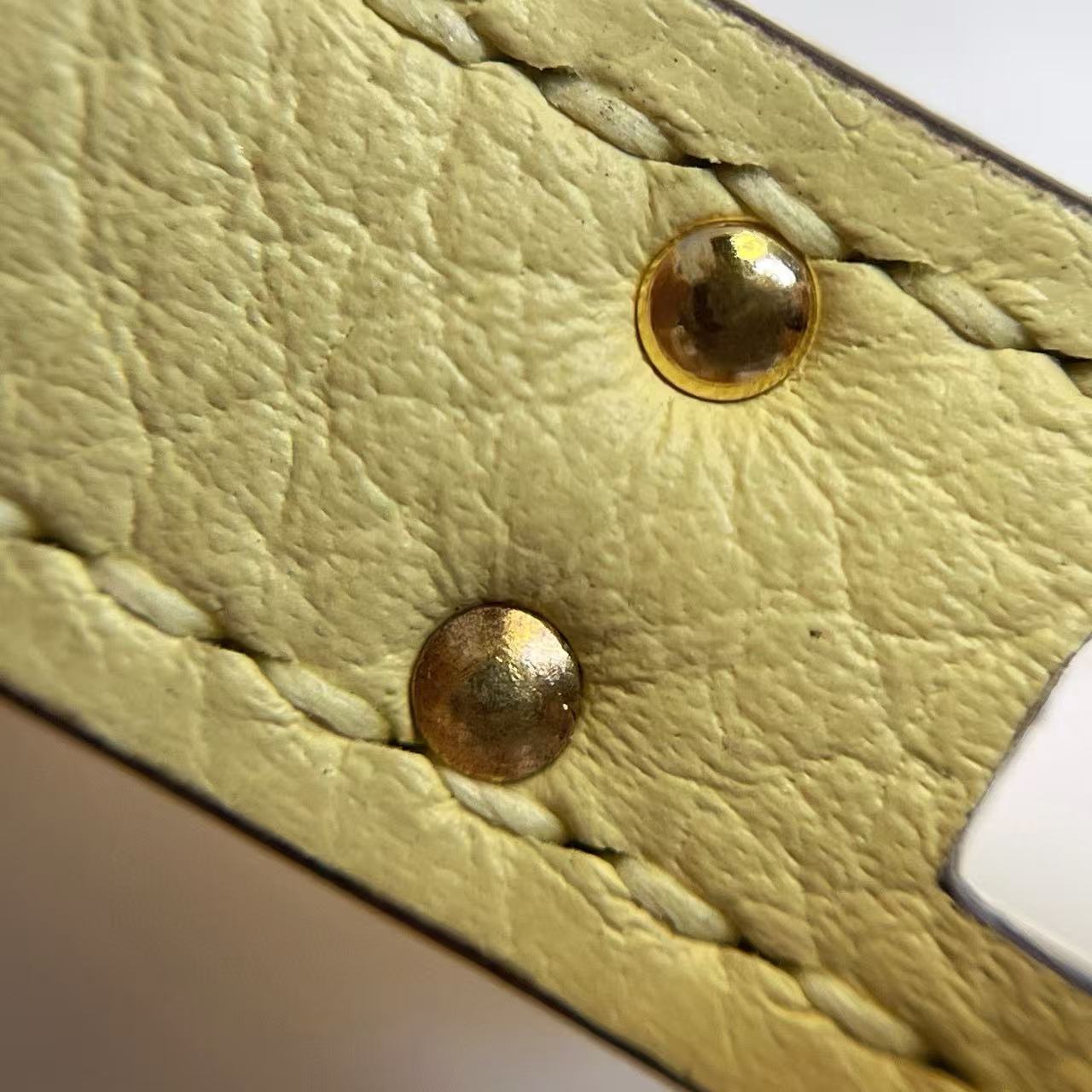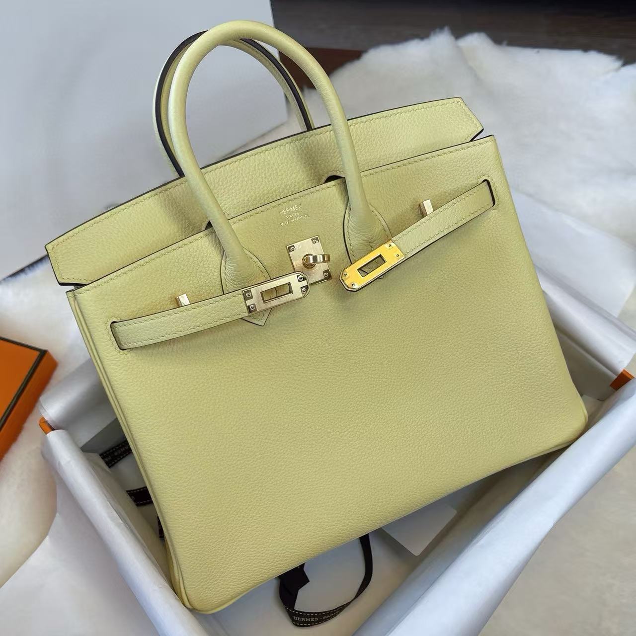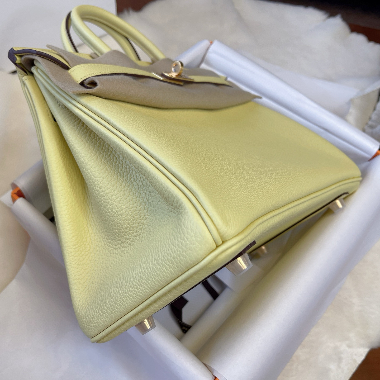 **基本資訊** 系列:Birkin 25 款式:單肩 / 手提 尺寸:25.0 × 20.0 × 13.0 cm 工藝結構:手工製作、立體包型、強化邊緣處理 材質:Togo 皮革 五金:金色調金屬件 貨號:H041344CC1Z 這款 Birkin 25 以輕盈挺括的 Togo 皮革為主體,搭配小雞黃配色與金色五金,整體呈現活力明亮又穩定乾淨的視覺效果。尺寸緊湊、比例清晰,適合多場景搭配。 ** 工藝解析:Togo 皮革的顆粒結構表現 Togo 皮革是許多經典包款常用的材質之一,以其天然立體顆粒、柔中帶挺與良好支撐性著稱。 它的特點包括: • 天然粒紋清晰,顆粒分布均勻 • 皮質柔韌但不鬆塌,結構穩定 • 使用過程中仍能維持包身輪廓 • 觸感溫潤,帶有自然霧感與回彈性 這種皮革非常適合強調廓形與線條的包款,使 Birkin 25 的呈現更加緊湊、銳利、乾淨。 **工藝細節:縫線、邊緣與線條的協調** 這款 Birkin 25 在細節處理上保持了統一而克制的工藝表現: 縫線結構: * 針腳均勻、線跡平直 * 轉角處理自然,與整體曲線匹配 * 線跡力度控制平衡,保持包型立體 邊緣收口: * 邊緣色層過度自然 * 表面觸感細膩,不顯毛糙 * 提升整體視覺的整潔度 包型結構: * 底部平衡度高,使包身站立穩定 * 手柄弧度與包身比例協調 * 正視、側視都有穩定的幾何感 整體結構呈現出「緊湊但不僵硬」的視覺基調。 **材質呈現:小雞黃配色的明快感** 小雞黃是一種明亮但不跳躍的黃色調,能夠在不同光線下呈現穩定且柔和的層次感。 色彩特點包括: * 色調輕快,視覺乾淨明亮 * 與 Epsom 壓紋結合後層次更清晰 * 表面光澤柔和,不會過度反光 * 在小尺寸包款上表現尤為友好 這種顏色讓 Birkin 25 在保持經典結構的同時,多了一份輕鬆與活力。 **五金細節:金色的點亮作用** 金色五金在小雞黃配色中具有平衡整個視覺重心的作用。 特點包括: * 色澤飽滿但不張揚 * 表面光潔,反光柔和 * 與黃皮革形成自然的明暗對比 * 讓整體風格更顯精緻與優雅 它在視覺上提供了一處焦點,但不會壓過皮料本身。 **尺寸與風格呈現** Birkin 25 的尺寸常被認為是兼具精緻感與實用性的小型包款: * 外觀緊湊,線條乾淨 * 體積輕巧,適合日常攜帶 * 上身比例靈動、不壓身高 * 色彩帶來友善、柔和的氛圍 小雞黃配色讓包款顯得更活潑,而 Togo 皮革的挺括性又保持了整體的精緻與清晰度。 **整體氣質總結** 這款 Hermès Birkin 25 小雞黃以 Togo 皮革的立挺質感、明亮色調與金色五金的暖色點綴共同構成其特有的風格: 清爽、明亮、俐落、耐看。 亮點來源於: * Togo 材質的結構優勢 * 小雞黃的色彩表現力 * 金扣提供的視覺平衡 * 小尺寸帶來的精緻感 整體呈現一種輕快卻保持審美穩定的氣質。