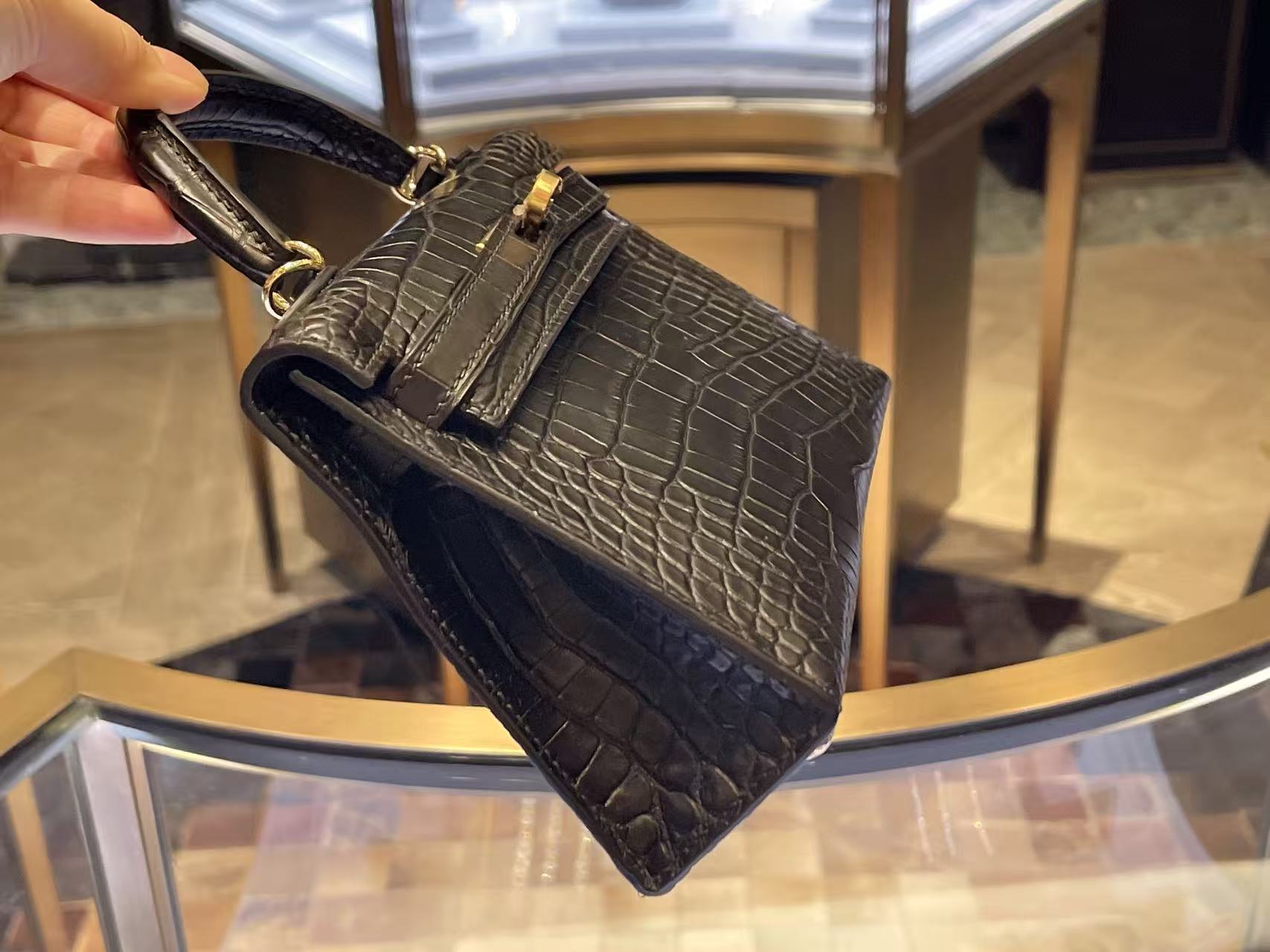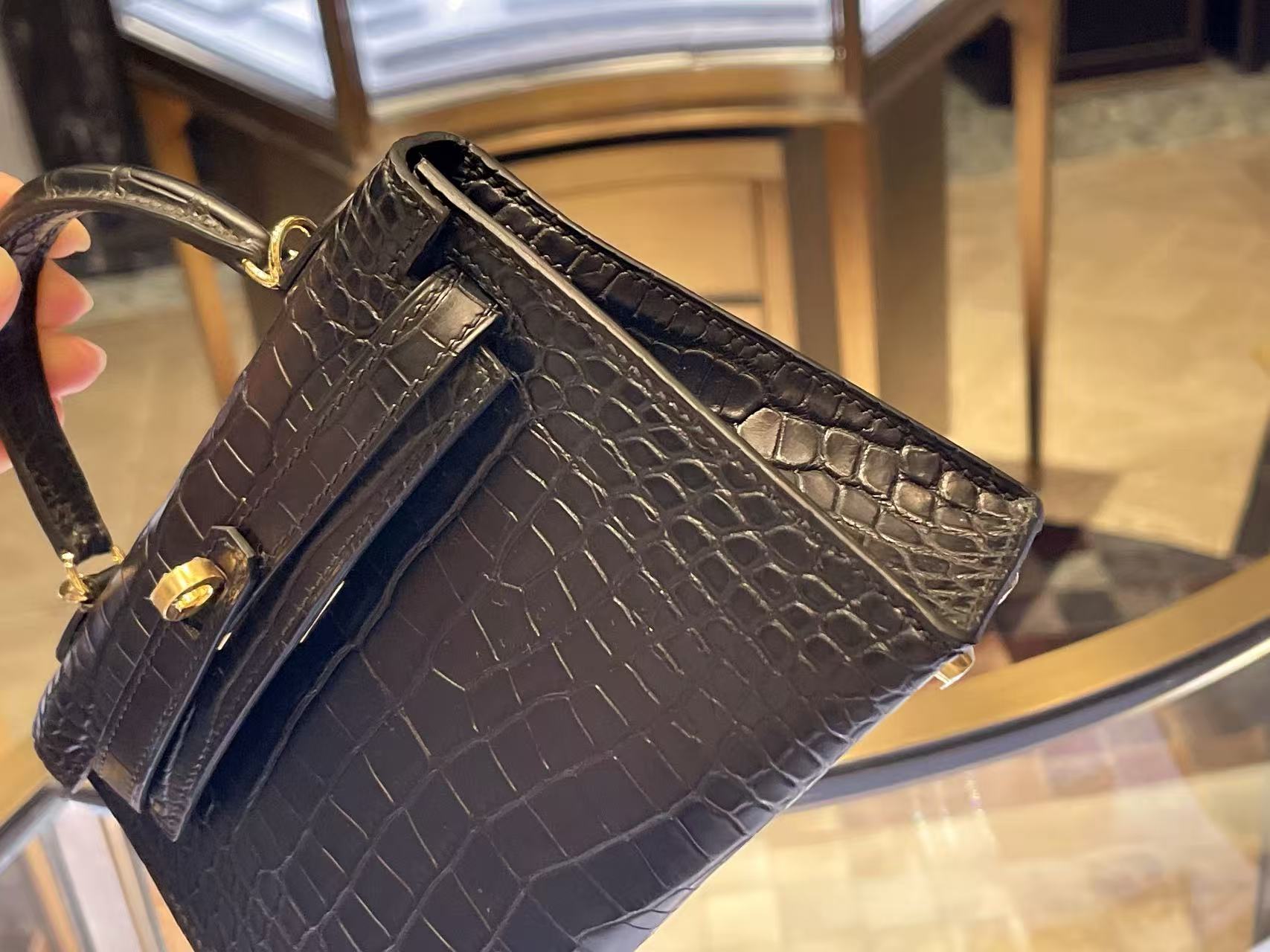 霧面鱷魚皮的特點在於光澤更收斂,鱗片紋理透過光影展現低調層次感。黑色皮面沉穩內斂,使包款在小尺寸中仍具備強烈的視覺存在。