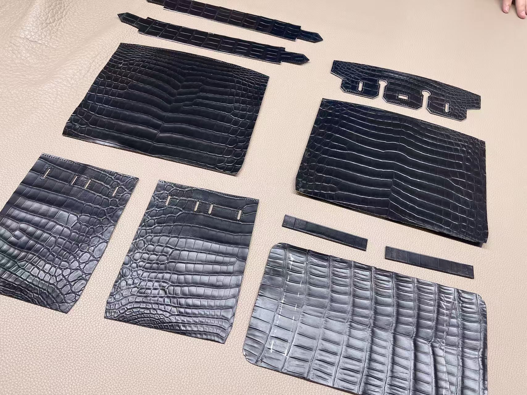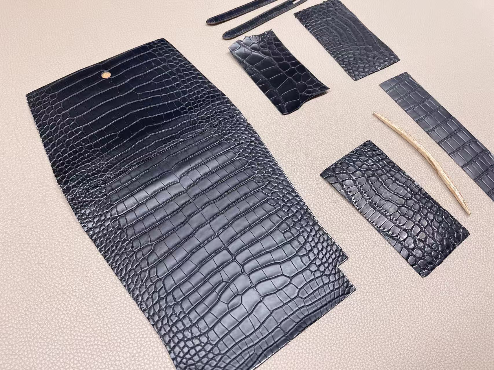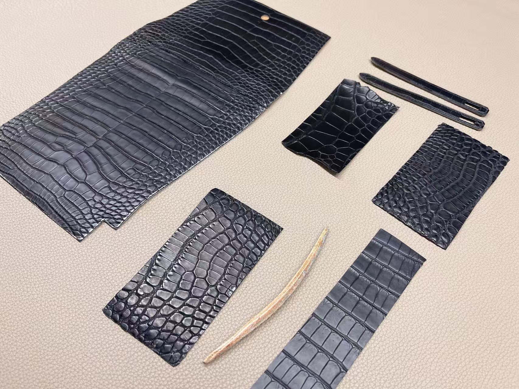 鱷魚皮收邊工藝需高度控制,邊緣經多次上邊油與拋光處理,使曲線精準一致。