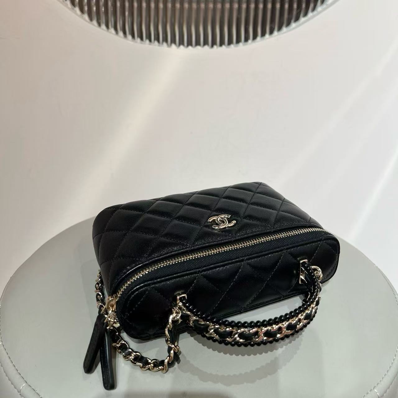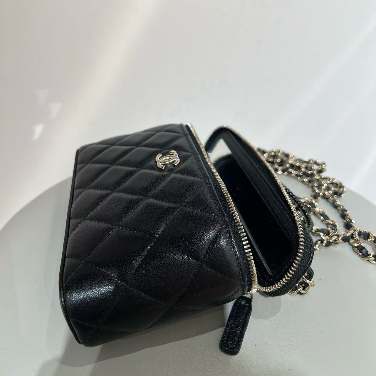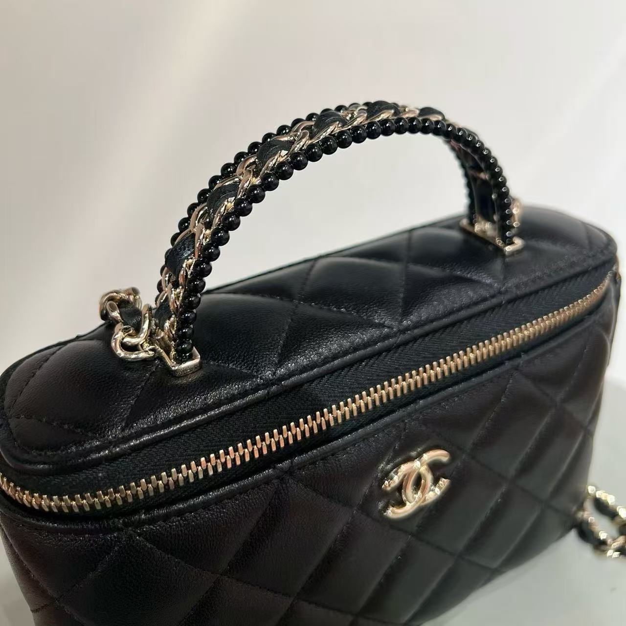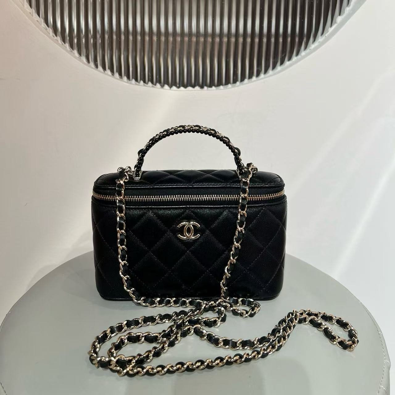 基本資訊 Chanel 25C Box Bag 採用俐落方盒輪廓,具備單肩、斜挎與手提多種揹法。包型尺寸為 20 × 8 × 12 cm,比例緊湊而利落,適合日常與輕正式場合。整體以粒面小牛皮打造,手感緊緻細膩,搭配翻蓋磁扣設計,並附有防塵袋、原裝盒與說明書,呈現此系列一貫的純粹風格。 款式:單肩/斜挎/手提 材質:粒面小牛皮(Caviar Leather) 皮質特徵:菱格紋車線 五金:金屬鏈條、金屬徽標扣 閉合方式:翻蓋磁扣 隨附:防塵袋、原裝盒、說明書 工藝解析 Box Bag 的造型核心來自其立體方正的盒型結構。內層支撐材料與外層皮革的比例經過精準掌握,使包身在長時間使用後仍能保持良好挺度。翻蓋式磁扣開闔順暢,線條乾淨俐落,呈現 Chanel 擅長的現代美學。 粒面小牛皮以耐磨與紋理感見長,表面細緻的顆粒壓紋,使菱格紋車線更加立體分明。裁片前需依照紋理方向排列,以保持整體視覺一致與皮面張力的自然延展。 細節賞析 皮革質感 粒面小牛皮觸感緊實,紋理細膩,使黑色皮面在光線下展現柔和的啞光效果。菱格紋車線讓包身具備更鮮明的立體層次,是 Chanel 經典識別之一。 縫線工藝 菱格線條以等距針腳構成,線跡飽滿均勻。邊角處採用圓潤收邊方式,並於受力點進行加固,使整體結構既精緻又耐用。 皮穿鏈肩帶 金屬鏈條經過拋光處理,觸感滑順,皮革穿鏈部分柔軟服貼,揹負時兼具舒適度與視覺亮點。肩帶長度可輕鬆切換單肩或斜挎,增添搭配的靈活性。 徽標扣件 正面金屬徽標扣為包款視覺中心,簡潔而具辨識度,使整體在低調中保留品牌語言。 容量與使用體驗 小巧盒型內部空間精緻但實用,可容納手機、卡夾、鑰匙、口紅等日常小物。結構方正,使物品收納清晰,適合都市日常、聚會與輕正式場合。 保養建議 粒面小牛皮雖具備良好耐磨性,但仍建議避免長時間與尖銳物摩擦。存放時置於防塵袋,放在乾燥通風處;避免強光照射,以保持皮革原有質感。 風格與氣質 黑色 Box Bag 的美學關鍵在於「經典 × 摩登」: 菱格紋象徵品牌傳承 方盒線條呈現俐落力量感 金屬鏈條增添精緻與態度 整體風格兼具優雅、現代與實用,是一款能輕鬆融入多種穿搭語境的百搭單品。